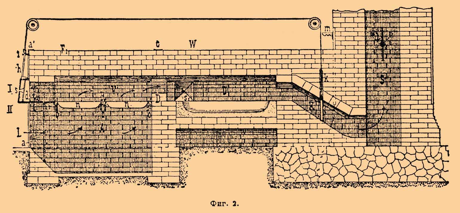 Поэтому истопник единовременно с открытием дверец очага, для добавки свежего топлива, должен прикрывать клапан или задвижку трубы. А чтобы это не зависело от доброй воли кочегара, иногда механически соединяют дверцу очага и задвижку дымовой трубы так, чтобы при открытии первой — вторая сама собою убавляла пролет трубы, как видно и на приложенном рисунке (цепь от подъемной дверцы dhi проходит через блоки к задвижке k, фиг. 2). Особое практическое значение в устройстве Т. имеют колосники, так как они часто требуют возобновления и должны легко заменяться новыми, по частям, а между собою оставлять достаточный проход воздуха. Общая площадь, на которую помещается с возможною равномерностью топливо, состоит обыкновенно из целого ряда параллельных колосников, представляющих в поперечном разрезе усеченный очень острый треугольник с узкою частью, направленною вниз, а в верхней части каждого колосника, по концам, делаются такие расширения, что при плотном сжимании колосников между ними остаются узкие щели, через которые проходит в Т. воздух, а само топливо не может проваливаться, хотя зола и самые мелкие куски угля могут выпадать в поддувало. Коничность колосников и расширение отверстия между колосниками книзу допускает это проваливание и облегчает при надобности очищение отверстий продольным движением железного прута снизу из поддувала. На своих краях колосники свободно лежат на особых поперечных краевых полосах, за которые обыкновенно зацепляются особыми отростками. Заметим под конец, что простейшим из многих способов, которыми можно судить о скорости тяги воздуха в Т., служит водяной манометр, одно колено которого соединено с пространством внутри печи, а другое колено сообщено с наружным воздухом (открыто), что представляет манометр, показывающий перевес внешнего (воздушного) давления над внутренним или над газами внутри печи. Этот перевес при обычной хорошей тяге печи обыкновенно выражается столбом воды в 10 мм высотою, но в особых случаях его доводят и до 25 мм, хотя нередко наблюдается давление и не более 5 мм водяного столба.