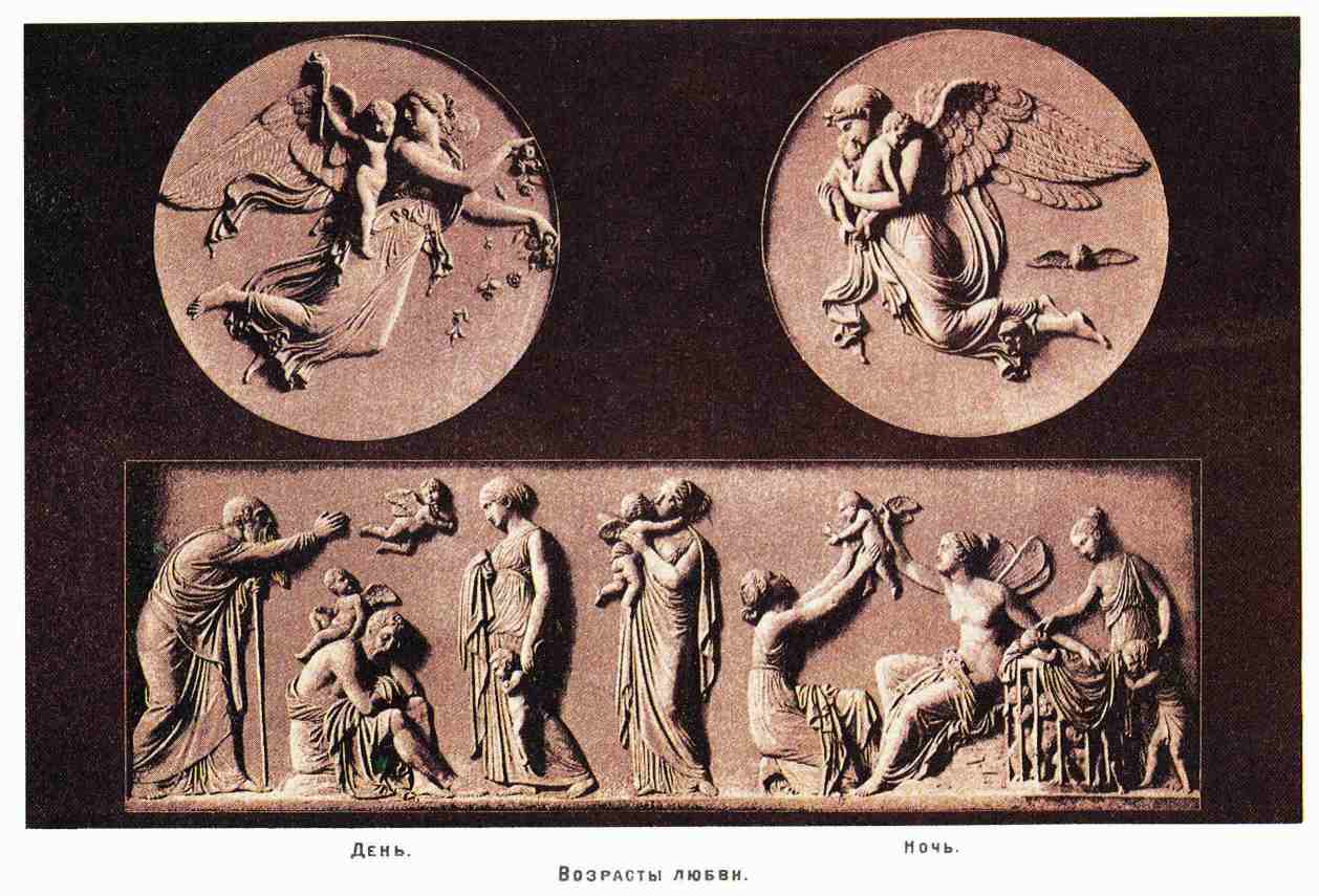 Геба Кановы, с роскошными зрелыми формами своего обнаженного торса, в коротком одеянии, и в своей резво-танцующей позе, скорее походит на легкомысленную танцовщицу, на вакханку, тогда как Геба Т. — настоящая олимпийская богиня в одеянии древнегреческих женщин и вместе с тем истинное олицетворение девственно-чистой, ясной, как майское утро, юности. Второе из названных произведений, которым восхищаются даже не расположенные к Т. критики, занимает довольно изолированное положение в творчестве Т. Самый сюжет — готовящееся убийство — уже довольно чужд Т.; зато в обработке этого сюжета Т. остается верен себе. Он не имеет ничего общего с Веласкезом, который изобразил бога Меркурия, ползущим к своей спящей жертве на животе, с обнаженным мечом в руке. Т. выбрал из сюжета сравнительно еще невинный, но захватывающий момент. На первый взгляд столь безобидно-праздное положение полусидящей, полустоящей фигуры с только что отнятою от губ цевницею, маскирует кровавый замысел. Правая, с виду так мирно болтающаяся нога, на самом деле прижимает пяткой ножны меча, чтобы легче было вытащить последний свободною рукою. Черты лица и поза фигуры выражают напряженную бдительность и готовность перейти к действию. Последнее передано в особенности превосходно, так и кажется, что Меркурий сейчас встанет и выхватит меч. История происхождения этой удивительной статуи в высшей степени характерна для уяснения того, как работал Т. Однажды, оправляясь обедать, Т. заметил полусидящего, полустоящего в дверях дома молодого итальянца, красота и оригинальность позы которого поразила скульптора; он прошел было мимо, но с полдороги вернулся и, застав юношу все в той же позе, не замедлил хорошенько запомнить все детали положения, затем наскоро пообедал и немедленно вернулся домой, чтобы засесть за эскиз новой статуи, а на другой день уже серьезно взялся за работу над моделью "Меркурия". Свойственное всем произведениям Т. благородство поз и всего облика особенно ярко сказывается в его собственной статуе, изваянной им самим. Это образ монументальной широты, уверенности, твердости и олимпийского спокойствия, говорящий о том, что олицетворяемый им и создавший его человек — великий, редкий человек, гений. В барельефе "Возрасты любви" трактуется тема, вообще проходящая красной нитью в творчестве Т. — "власть Эрота". Т. как бы говорит целым циклом своих произведений: "Что такое сила, власть, мужество, даже красота? Все решает в конце концов любовь!" Но Эрот Т. не просто шалун и баловень олимпийского царства, это — триумфатор, победитель богов и людей, отбирающий трофеи от великих и мощных богов, седлающий и представителя воздушной стихии, орла Юпитера, затем представителя водной стихии — дельфина, усмиряющий адского цербера, доводящий мощного царя зверей, льва, до того, что тот смиренно лижет ему ножку и пр. Произведения Т. совершенно лишены чувственной подкладки, как была чужда ее и самая натура Т. При разработке тем любви, он не обнаруживает и восторженного опьянения ее властью, но просто изображает последнюю с точки зрения спокойного, трезвого, хотя и сочувствующего, но в то же время и слегка иронизирующего наблюдателя, с улыбкою превосходства указывающего на всепроникающую, решающую силу Эрота и с очевидным удовольствием отмечающего, насколько важно для уразумения сути жи