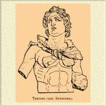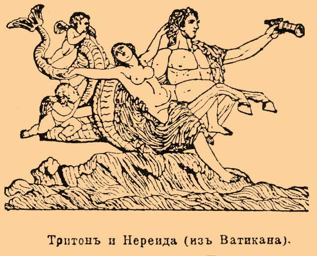 По другому преданию, танагрийцы, скот которых похищал Т., отрубили ему голову, когда он, опьянев, заснул. Кроме беотийской реки Т., существовала река Т., с мифическим Тритоновым озером, в Ливии. Сюда, по преданию, был занесен бурею Язон и, лишь благодаря содействию Т., избавился от беды. Обыкновенно Т. называется морским старцем (άλιος γέρον), но наружность его, судя по памятникам искусства, изображалась различно. По Павзанию, у Т. вместо ног хвост, как у дельфинов. В цветущую пору искусства греческие художники нередко прикрывали одеждой нижнюю часть тела Т.; позднее она была изображаема в виде двух рыбьих хвостов, а спереди к туловищу придавались конские грудь и ноги, так что получалось чудовище тройной породы, — так назыв. морской кентавр. Атрибутами Т. были дельфин, рог для вина, витая раковина. С помощью последней он извлекает то бурные, то нежные звуки, смотря по тому, поднимает ли он бурю или успокаивает расходившуюся водную стихию. Мизен, знаменитый трубач Энея, погиб оттого, что дерзнул вызвать Т. на состязание в игре на роге. Даже гиганты обратились в бегство при зычном звуке Тритоновой раковины. В поэзии мы встречаем Т. в различных положениях: то он преследует своими любезностями морских нимф, то, подобно Посейдону, ударяет в скалы трезубцем, то носится по волнам на великолепных конях, то показывается на берегу, где подкарауливает людей и пожирает их. С IV в. до Р. Х. Т. мало-помалу утрачивает индивидуальность и, подобно Силену, Пану и друг., становится мифологическим родовым понятием. Как Сатиры, Паниски, Кентавры на суше, так Т. на море представляют собою однородную семью божества: они влюбчивы, задорны, капризны, носятся с шумом по морю и трубят в свои раковины, олицетворяя шумный, переменчивый, капризный характер водной стихии, с таинственною жизнью ее глубины. В художественных изображениях из жизни морских божеств Т. — необходимые фигуры. Одним из замечательных произведений искусства была большая группа Скопаса, которую Плиний видел в Риме: в числе морских божеств были изображены в ней Нептун, Фетида, нереиды, дельфины, киты, гиппокампы (морские кони), хор Форка, Т. и проч. В позднейшем декоративном искусстве Т. — любимые сюжеты; об этом свидетельствуют вазовая живопись, фрески, мозаики, серебряная утварь, рельефы из терракоты, саркофаги и проч. Ср. Escher, "Triton und seine Bek ä mpfung durch Heracles"; Dressler, с Triton und die Tritonen" (гимназич. программа, Вурцен. 1892): Preller, "Griechische Mythologie" (I т., 4 изд., стр. 598 и сл., Б., 1894).