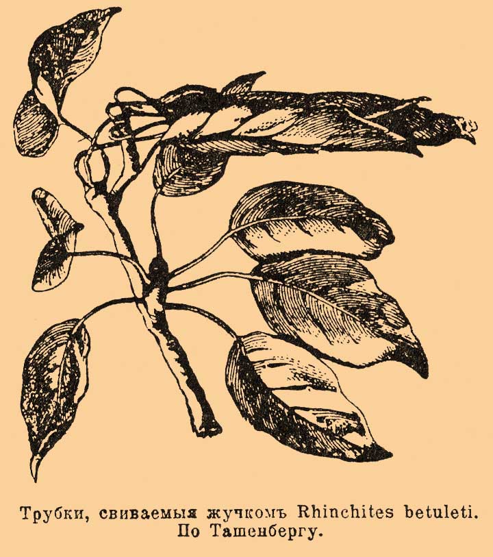 Трубки, свиваемые жучком Rhinehites betuleti. По Ташенбергу.