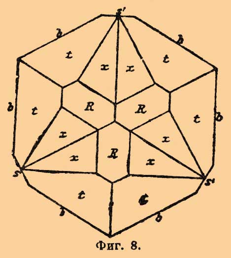 Но часто к этим формам присоединяются еще b{110}∞P 2 и θ {321}, ∞P5/4, тогда кристаллы приобретают цилиндрический характер (фиг. 4). Очень редко кристаллы бывают короткопризматичны (Цейлон, Andreasberg). Что касается комбинаций форм обоих полюсов Т., то здесь наблюдается очень резко выраженный гемиморфизм, именно антилогичный полюс представляет обыкновенно комбинацию нескольких форм из числа следующих: R{100}R, е {111} — 2R, и {320}R5, d{311}4R, x{211} — ½R3, о {111}0R, аналог же из: R'{100}R, n'{101} — ½R, t'{210}R3, о '{111}0R. Например (фиг. 5), антилог: R, e, u, d, o, n ,x, аналог: R', n', t ' (Т. из Pierrepont, Америка) или же (фиг. 6) антилог o, R, e, d, аналог о', R', e' (Т. из деревни Шайтанки, Урал).