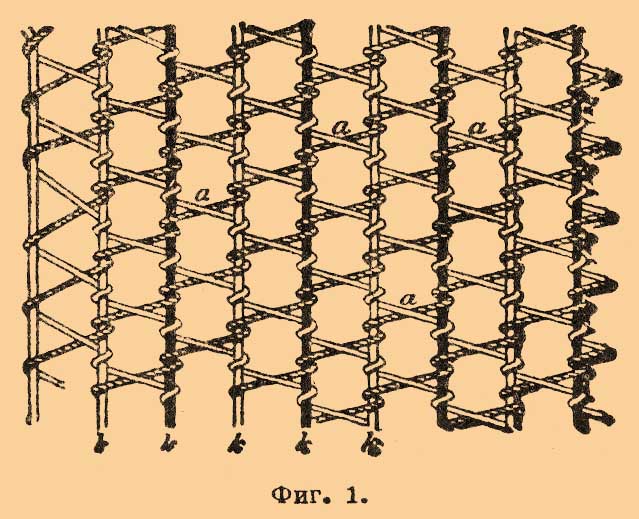 Он состоит из двух систем нитей: вышеупомянутой основы k и диагонально идущих по двум направлениям бобинных (уточных) нитей — а , обвивающих каждую нить основы. Подобно плетеным изделиям (см.), каждая уточная нить, дойдя до края ткани, огибает крайнюю нить основы и направляется обратно, сохраняя прежний угол относительно нитей основы. В готовом и расправленном виде гладкий Т. кажется состоящим из мелких шестиуголных ячеек (фиг. 2).