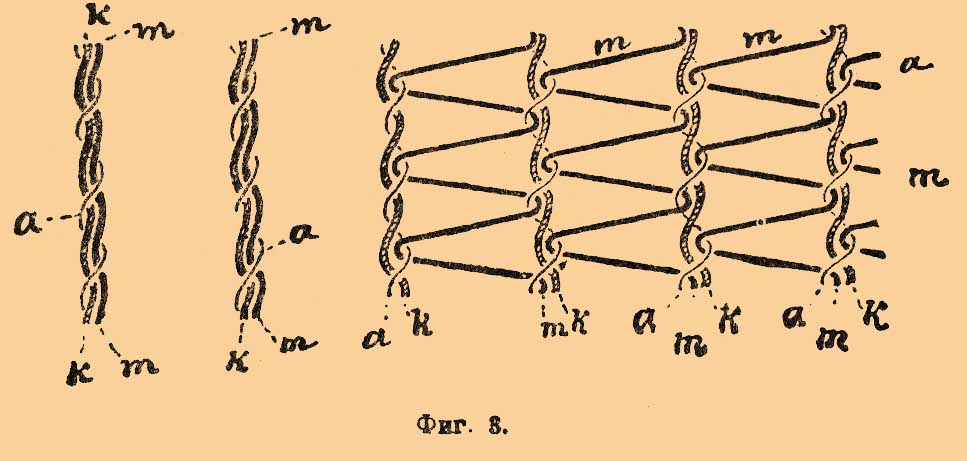 Т. узорчатый (гардинный) характеризуется присутствием трех систем нитей (фиг. 3): основы k, подобной вышеописанному Т., второй основы, узорной состоящей из нитей m, которые идут то параллельно, прилегая к нитям первой основы (фиг. 3, левая часть), то зигзагообразно между двумя смежными нитями основы (фиг. 3, правая часть) и, наконец, из бобинных нитей — а, которые здесь обвивают постоянно ту же самую нить основы, связывая ее с прилегающими к ней нитями узорчатой основы.