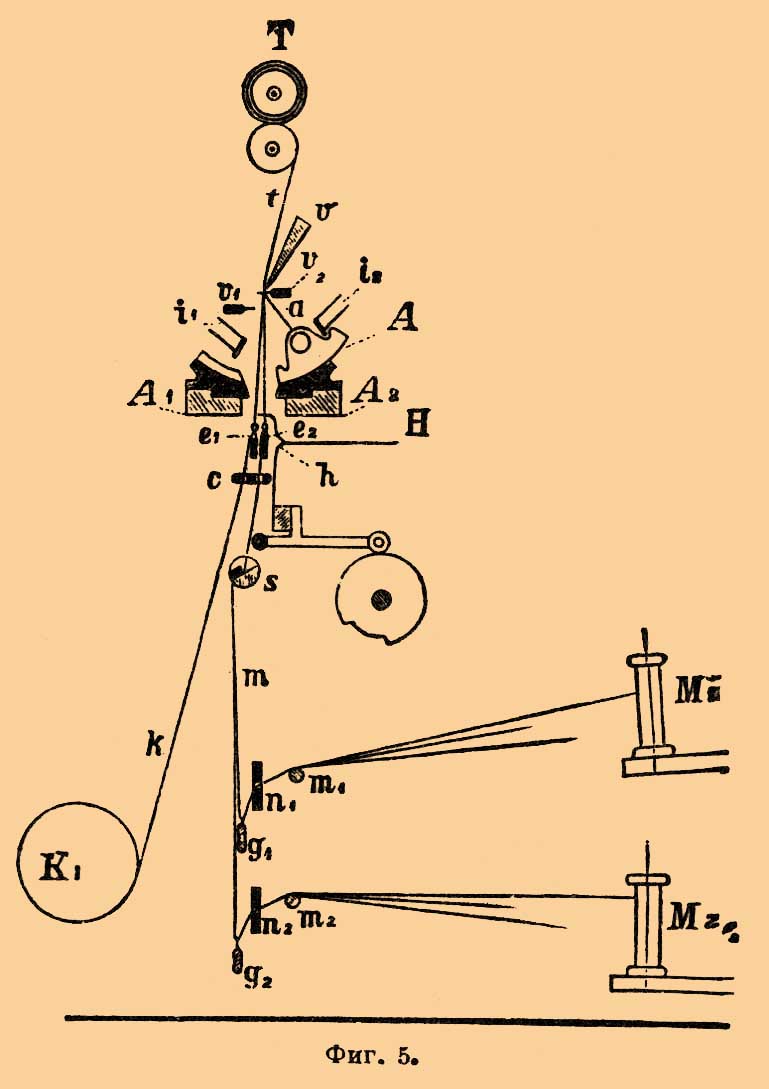 Главная основа k намотана на навой К 1, с которого направляется вертикально вверх и, образуя ткань t, наматывается на другой навой Т, расположенный наверху станка. Нити основы, проходя через неподвижную направляющую планку с, продеты через глазки подвижной планки е 1, могущей двигаться в поперечном направлении. Нити узорной основы т намотаны, каждая отдельно, на катушки М 1 М 2. С них они проходят через натяжные грузики g1g2, зажимное приспособление s и через глазки подвижной планки е 2, расположенной рядом с планкой е 1. Над планкой е 2 расположены концы крючков h (селекторов), служащих для воспроизведения узора. Для соединения между собой нитей обеих основ служат бобинные (уточные) нити а, намотанные на плоские бобинки а 1, помещенные в узких (иногда до 1 мм) секторообразных челноках А. Фиг. 6 представляет в более крупном масштабе боковой вид, а фиг. 7 — план челноков А и их направляющих желобов A1 и А 2.