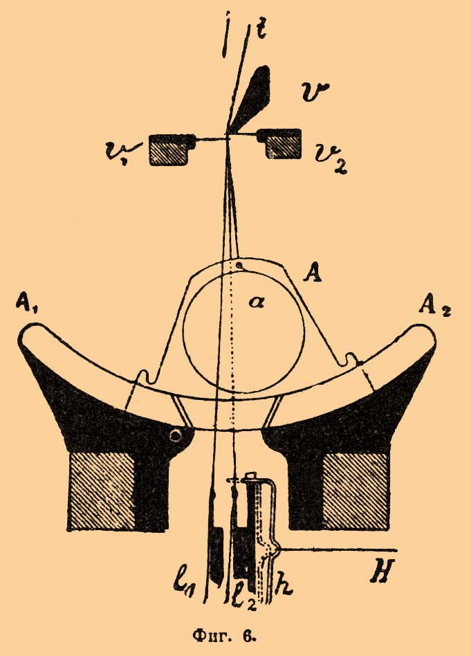 Желоба эти снабжены узкими желобками w, w, по которым челноки скользят своими нижними дугообразными краями. Движение челнокам передается или посредством зубчатых колесиков, вращающихся под направляющими желобами, для чего и челноки снизу снабжаются зубьями, или же, как это показано на наших рисунках, посредством двух крючков i1 и i2 (фиг. 5), захватывающих попеременно за выступы, имеющиеся с двух концов челнока. Направляющие желоба А 1 и A2 разделены промежутком, в котором помещаются нити обеих основ. На фиг. 7 изображены в плане 4 челнока в то время, когда они при своем движении переходят из одного направляющего желоба в другой, проникая в промежутки между основными нитями. После того как челноки пройдут через зев, направляющая планка е 1 (на ф. 6 — l1) передвинется настолько, чтобы нити главной основы k оказались по другую сторону пути своих челноков, которые в своем обратном передвижении обовьют, таким образом, бобинной нитью нити главной и прилегающие к ним нити узорной основы m. Последние направляются двумя приспособлениями: планкой е 2 (на ф. 6 — l2) и крючками (селекторами) A. Планка е 2 имеет такое движение, что стремится подводит известную узорную нить попеременно то к одной, то к другой из смежных нитей главной основы. Между тем, селекторы имеют движение, совпадающее с движением планки e2, и, действуя на нити т выше глазков e2, принуждают их двигаться постоянно в соприкосновении с одной которой-нибудь нитью k. Поэтому под действием селекторов получается плетение, изображенное на левой стороне фиг. 3. Селекторы нитями Н, соединенными с жаккардовым механизмом, могут отклоняться назад, как это видно на фиг. 6. Тогда они не действуют уже на нити m, и последние, следуя движению планки l2, прилегают попеременно к двум смежным нитям главной основы, образуя плетение, изображенное на правой стороне фиг. 3. В первом случае получается прозрачный фон, а во втором — сплошные места узора. Гребенки v1 и v2 играют роль баттана ткацкого станка, прибивая новые петли к ранее образованным, поддерживаемым линейкой v. Подобным же способом плетутся некоторые сорта кружев, при чем образованное широкое полотно выдергиванием определенных нитей разделяется на ряд полосок (прошивки). Изготовление гладкого Т отличается от вышеописанного, во-1-х, отсутствием узорной основы, селекторов и направляющих планок e1 и e2, а во-2-х, тем, что челноки с бобинной нитью, кроме описанного выше качательного движения, перемещаются еще постепенно по всей ширине ткани от одного ее края до другого и обратно. Для этой цели направляющим желобам А 1 и А 2 придается попеременное боковое (по направлению ширины ткани) перемещение на небольшую величину после каждого пролета челноков, так что челнок, вышедший из известного желобка (гнезда), при обратном своем ходе попадает уже не в тот же, а в соседний желобок и при следующем размахе обвивает уже не прежнюю, а соседнюю с ней нить основы. Для того, чтобы достигнуть и обратного передвижения челноков, располагают ход их таким образом, что, когда четные челноки идут из А 1 в А 2, нечетные двигаются обратно, из А 2 в А 1, отчего при упомянутом перемещении желобов А 1 и А 2 и получается взаимно противоположное движение тех и других челноков. Иначе цель эта достигается расположением в каждом желобке (гнезде) по два челнока, переходящих с одной стороны ткани на другую пооч