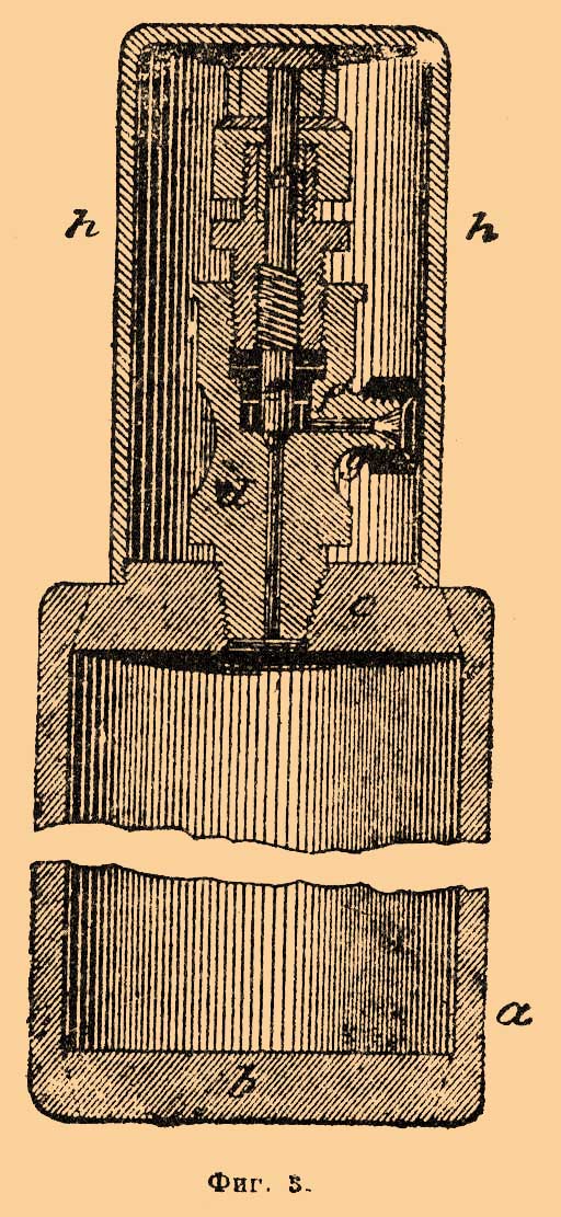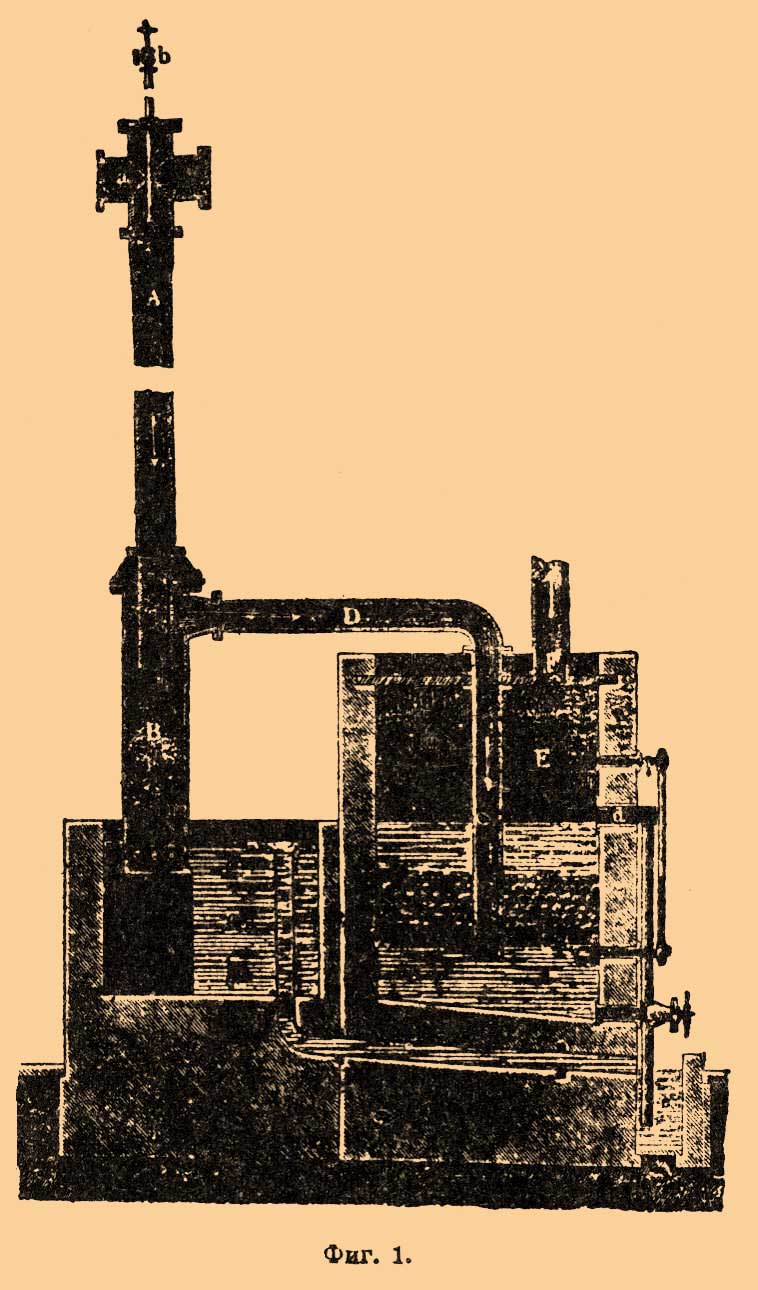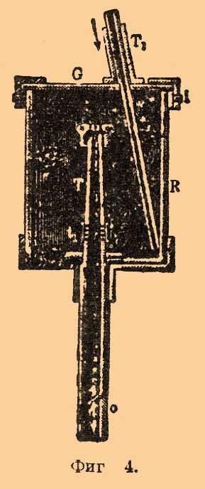 R — эбонитовый цилиндр; крышка его g удерживается на месте штыковым затвором i. Жидкая У. поступает в прибор по трубке T, которую соединяют с цидиндром с жидкой У при помощи каучуковой трубки. У. отвердевает только отчасти; несгустившиеся газы уходят наружу по эбонитовой тру6ке T, отверстия которой t, t' закрываются тонкой медной сеткой. Вместо этого прибора употребляют иногда толстый шерстяной конической формы мешок, который обвязывают около крана цилиндра с жидкой У.