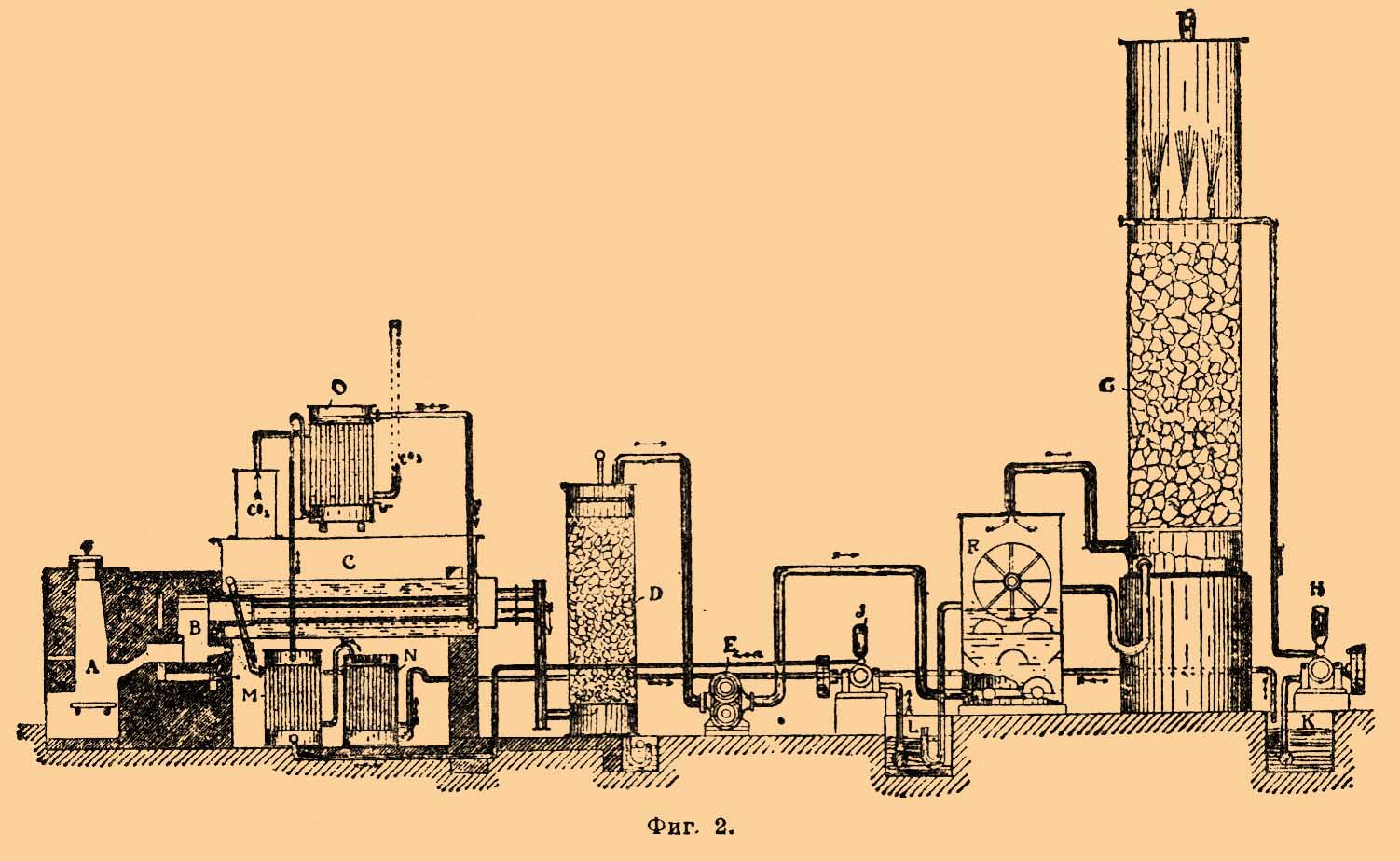 А — длинная вертикальная труба с тройником наверху; через два колена его а входит в трубу А газ, а в третье вставлена водопроводная трубка b, откуда брызжет вода тонкими струйками. Вода стекает по трубе В в цистерну С и затем по воронке с и желобу е уходит вон. Газ по трубе идет в резервуар Е, в котором на некотором расстоянии от дна лежит решетка, покрытая слоем известняка. В резервуаре Е постоянно циркулирует вода, уровень которой поддерживается на одной и той же высоте: вода вытекает по трубке d в желоб е. Газ, пройдя через слой известняка и через воду, выходит из аппарата через трубу F. Полученный таким способом газ содержит не более 25—30% CO 2 и в некоторых случаях вполне годен для употребления, как напр. в сахарном производстве, где примеси не играют существенной роли и такая концентрация вполне достаточна. Для получения сравнительно чистого газа, как это необходимо для производства жидкой CO 2, приходится очищать в такой газовой смеси CO 2 от посторонних газов. Полученный газ подвергается обработке соответственной жидкостью, которая поглощает CO 2 в несравненно большей степени, чем примеси к ней; затем из раствора извлекают CO 2. По предложению Озуфа, для этой цели очень пригоден раствор соды; поглощая на холоду CO 2, она переходит в двууглекислую соль NaHCO 3, которая при кипячении обратно распадается на соду и CO 2. В последнее время сода заменяется поташом. Полный ход всей операции получения CO 2 указан, между прочим, на фиг. 2, где CO 2 получается прямо из кокса.