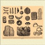 1—3. У.-амулеты пещерного человека древнекаменного века: просверленные резцы лошади (1 и 2) и челюсть дикой кошки (Пещера Гелефельс). 5—9. У.-подвески из швейцарских свайных построек каменного века: №№ 4—8 из оленьего рога и кости, №9 — просверленный зуб хищного животного. 10—17. У. из глины, камня новокаменного века Франконской Швейцарии. 18. Янтарная буса новокаменного века южной Швейцарии. 19. Золотое У. в виде рыбы из древнеевропейских находок (Феттерфильд, Нижняя Лузация). 20. Бронзовые У.: фибулы (застежки), булавки, браслеты, из свайных построек Пешьеры (Гардское озеро). 21. Фигурные У. на бронзовом панцире, из русла Алфея, близ Олимпии (Гальштатский период). 22а, 22б. Бронзовые У.-фибулы (застежки) из могильных находок в Глазинаке, Босния.