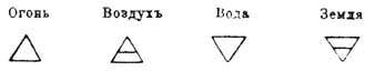 Происхождение и смысл этих знаков неизвестны точно. Возможно, что знак свинца должен изображать косу Сатурна, знак железа — щит и копье Марса, знак меди — ручное зеркало Венеры и т. п.: тогда их можно рассматривать, как знаки мифологических божеств, под названиями которых были известны металлы; но одинаково вероятно, что эти знаки являются и сокращениями имен тех же божеств. У алхимиков XIV—XVI вв. встречаются и такие объяснения, что замкнутый круг есть знак совершенства металла, полукруг (полумесяц) — знак приближения его к совершенству. Одновременно со знаками металлов с XIII же столетия начинают прививаться следующие обозначения 4 элементов Аристотеля: