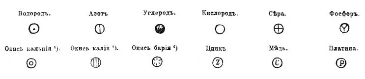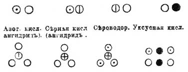 Эта количественная сторона нашла отчетливое и точное выражение в атомной теории Дальтона (см. Вещество, Веса атомов и Химия) и в предложенных им Ф., которые, впрочем, в других отношениях являлись малоудобными и потому не привились; исходя из убеждения в шарообразности атомов, Дальтон их изображал кругами, отличавшимися друг от друга различными условными знаками. Напр., по Дальтону: