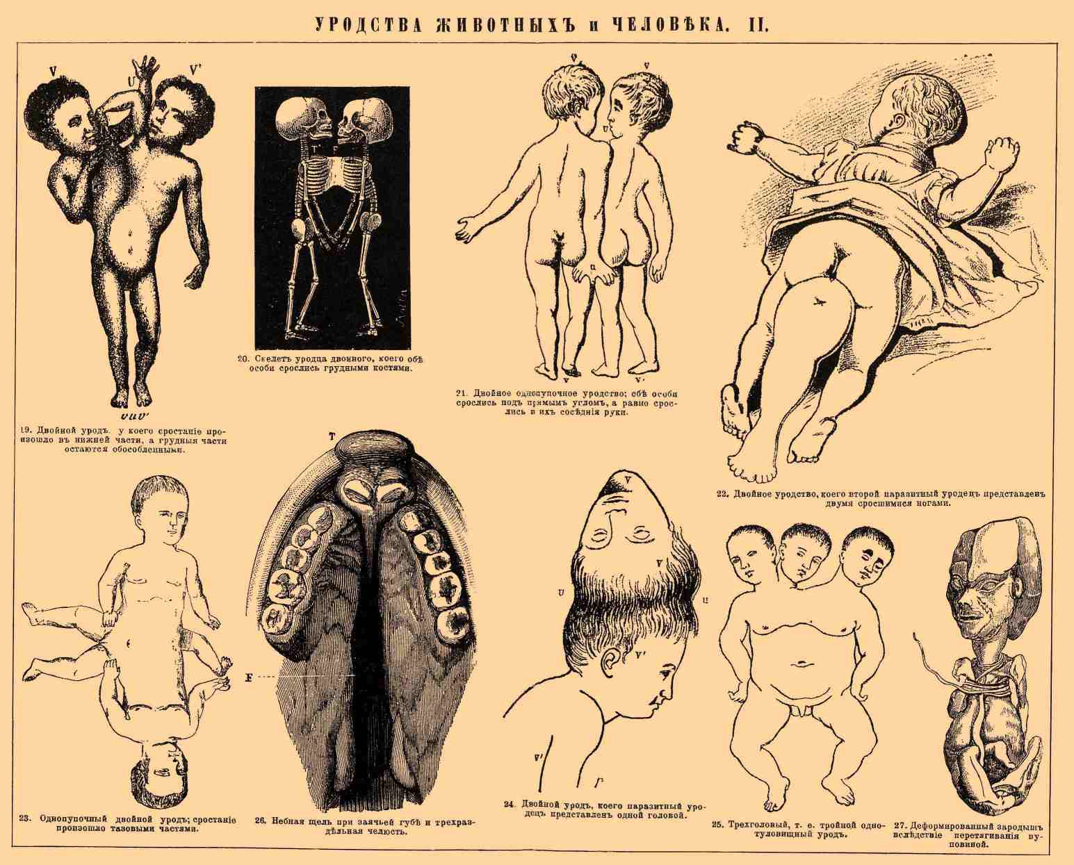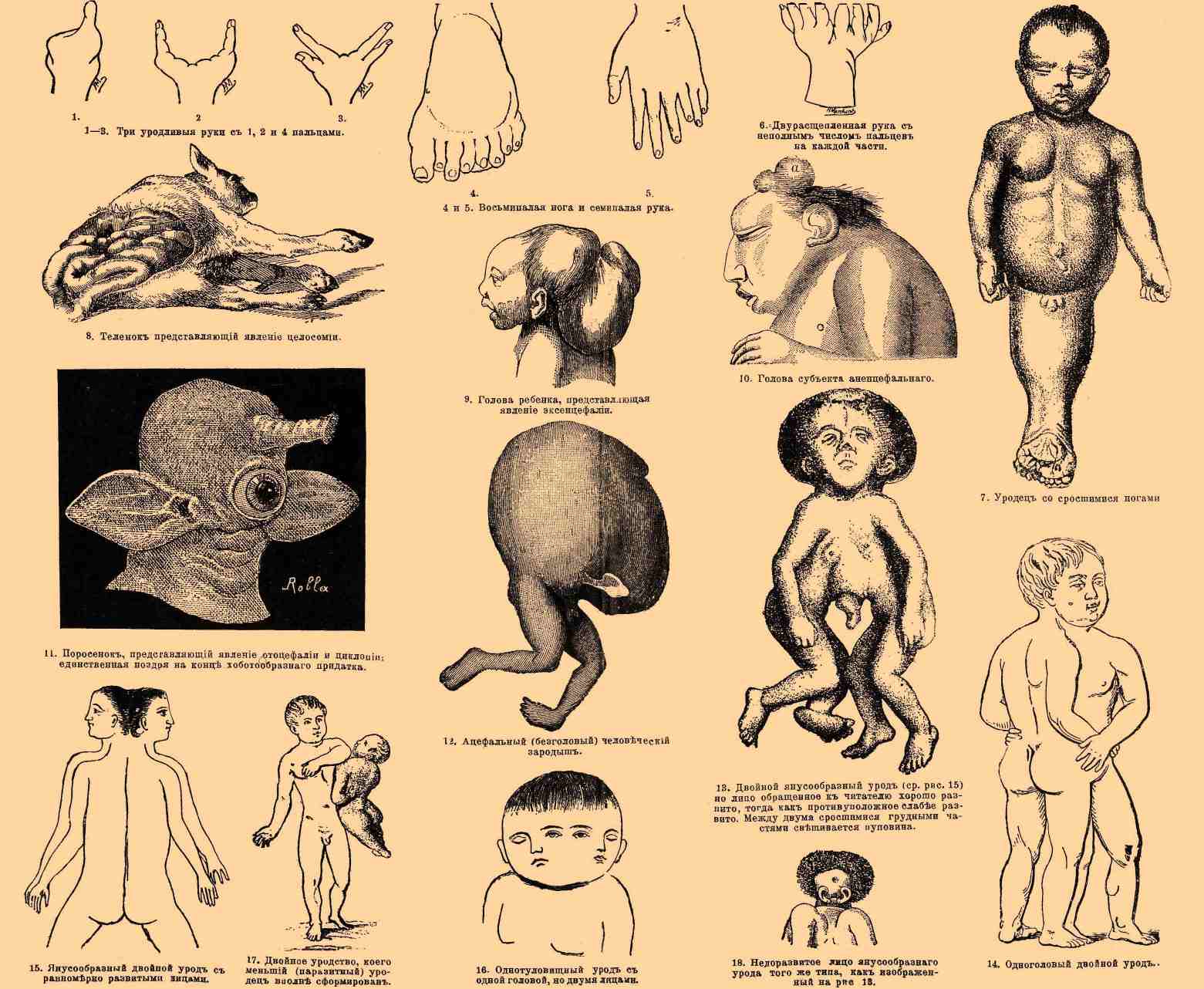 1—3. Три уродства руки с 1, 2 и 4 пальцами. 4 и 5. Восьмипалая нога и семипалая рука. 6. Двурасщепленная рука с неполным числом пальцев на каждой части. 7. Уродец со сросшимися ногами. 8. Теленок, представляющий явление целосомии. 9. Голова ребенка, представляющая явление эксенцефалии. 10. Голова субъекта анэнцефального. 11. Поросенок, представляющий явление отоцефалии и циклопии: единственная ноздря на конце хоботообразного придатка. 12. Ацефальный (безголовый) человеческий зародыш. 13. Двойной янусообразный урод (ср. рис. 15), но лицо, обращенное к читателю, хорошо развито, тогда как противоположное слабее развито. Между двумя сросшимися грудными частями свешивается пуповина. 14. Одноголовый двойной урод. 15. Янусообразный двойной урод с равномерно развитыми лицами. 16. Однотуловищный урод с одной головой, но двумя лицами. 17. Двойное уродство, коего меньший (паразитный) уродец вполне сформирован. 18. Недоразвитой лицо янусообразного урода того же типа, как изображенный на рис. 13.