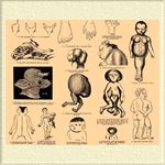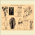 19. Двойной урод, у коего срастание произошло в нижней части, а грудные части остаются обособленными. 20. скелет уродца двойного, коего обе особи срослись грудными костями. 21. Двойное однопупочное уродство; обе особи срослись под прямым углом, а равно срослись и их соседние руки. 22. Двойное уродство, коего второй паразитный уродец представлен двумя сросшимися ногами. 23. Однопупочный двойной урод; срастание произошло тазовыми частями. 24. Двойной урод, коего паразитный уродец представлен одной головой. 25. Трехголовый, т.е. тройной однотуловищный уродец. 26. Небная щель при заячьей губе и трехраздельная челюсть. 27. Деформированный зародыш вследствие перетягивания пуповиной.