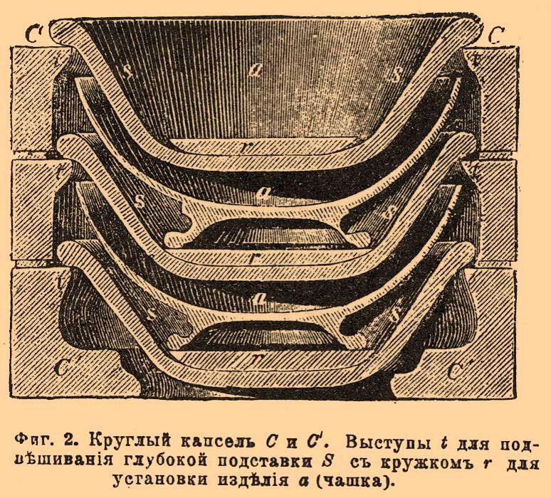 Вследствие более высокой температуры при обжиге Ф. для капселей требуется более огнеупорная глина, а способность Ф. размягчаться во время большого огня вызывает устройство в капселях особых приспособлений для отдельной установки каждой вещи (см. Фаянс). Вообще, установка Ф. для обжига требует большой опытности, как для выигрыша места, так и для самого успеха обжига.