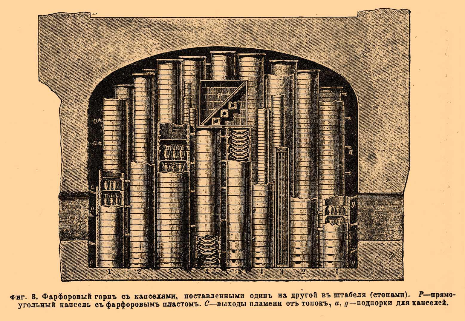 Фиг. 3. Фарфоровый горн с капселями, поставленными один на другой в штабеля (стопами). Р — прямоугольный капсель с фарфоровым пластом. С — выходы пламени от топок, а, g — подпорки для капселей.