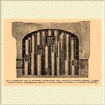 Нижнее помещение печи (горн) служит для окончательного обжига Ф. на большом огне, верхняя камера, поставленная на его своде, — для обжига на малом огне перед покрытием изделий глазурью. Нижняя камера окружена несколькими топками, число которых изменяется от 3 до 8, смотря по размеру печей; для лучшего распределения теплоты предпочитают устраивать печи, внутренний диаметр которых не превышает 5—6 м при высоте нижней камеры почти равной диаметру и лучше немного меньшей; камера 2-го яруса строится меньшей емкости в силу того, что изделия при обжиге на малом огне занимают меньше места. Направление пути пламени из топок таково, что оно, поднявшись до свода, опрокидывается вниз и уходит в виде печных газов в несколько отверстий пода нижней камеры, затем боковыми ходами, проделанными в толще окружки, призывается тягою трубы во 2-й ярус, откуда через отверстия в своде выносится трубою на свободу. Заслуживающее внимания изменение устройства печей этого типа заключается в том, что назначение обоих ярусов получается обратное, т. е. верхняя камера служит для обжига на большом огне (горном), а нижняя для малого. Для этого топки переносятся к окружке верхнего яруса, и призыв печных газов на свободу производится боровом под подом нижней камеры, в отдельно стоящую трубу. Очевидно, что при таком устройстве печные газы в обеих камерах, поднявшись до свода, должны повернуть к поду, отчего они проходят более длинный путь в стойле печи, чем в первой описанной печи, а потому находятся в более выгодных условиях для передачи тепла капселям с изделиями. О печах непрерывного действия — см. Фаянс. Время обжига твердого Ф. продолжается между 18—36 и иногда до 40 часов, при обжиге на дровах он тянется до 48 час. С легкого подогревания печи, при чем изделия теряют заключающуюся в них влагу, до приблизительно 1200° ведение обжига не представляет особенных затруднений, но начиная с этой температуры обжиг ведется в восстановительной атмосфере газов (с целью перевести заключающуюся в массе Ф. окись железа в закись), при чем легко получается копоть, которая садится на глазурь и производит черноту. Кроме того, обжиг твердого Ф., как массы, размягчающейся на большом огне, вообще представляет значительно большие трудности, чем фаянс. Охлаждение ведется при том же состоянии атмосферы горна до затвердения глазури, после чего, именно ниже 800°, допускают некоторый избыток воздуха. Нагрузка фарфорообжигательной печи (фиг. 2 и 3) ведется так же, как и для полевошпатового фаянса (см.).