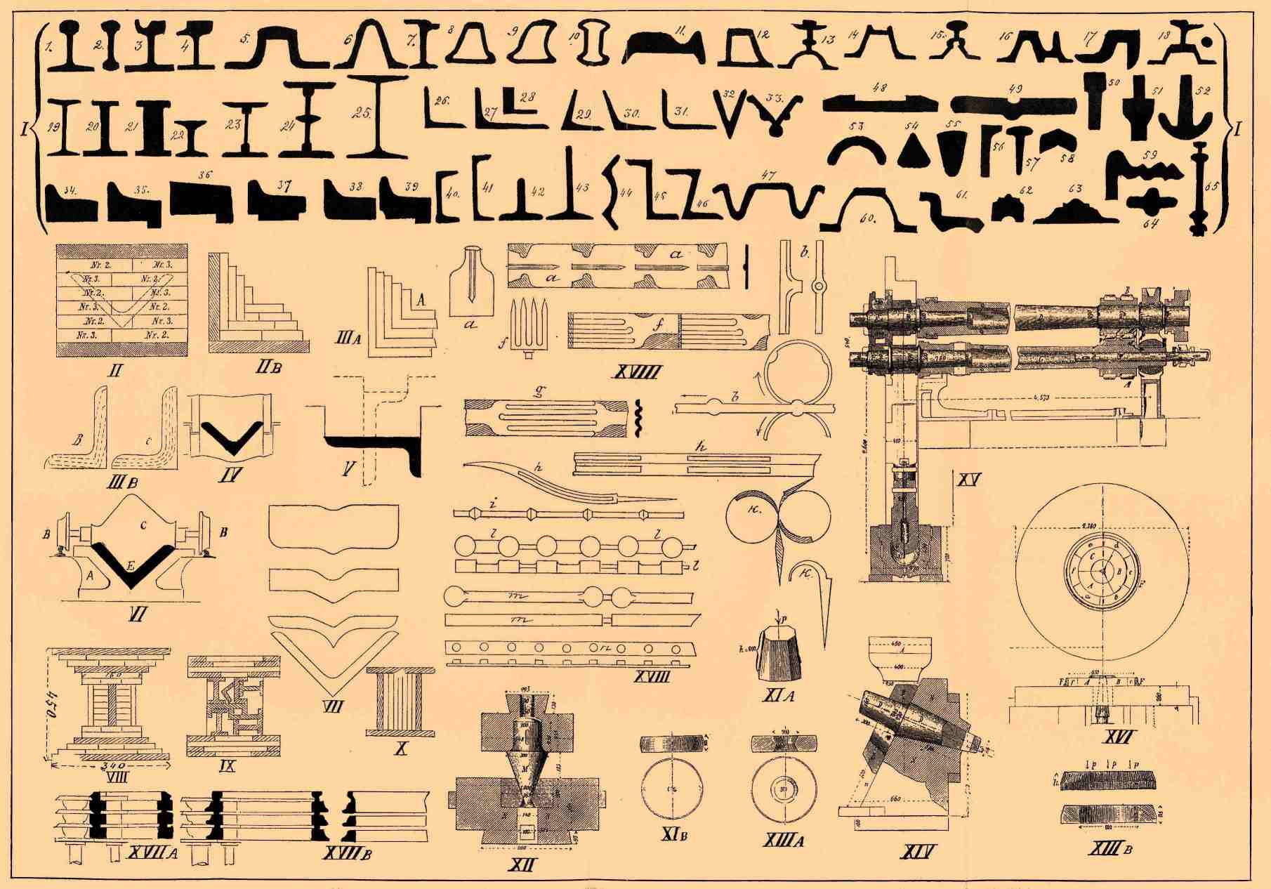I. Различные виды профилей Ф. железа и стали: 1—18 — профили рельсов, 19—25 — двутавровых балок, 26—33 — угольников; 34—39 — бандажей, 40 и 41 — швеллеров, 42 и 43 — тавровых балок, 44—65 — разные другие менее употребительные профили. II. Способы пакетирования угольников из полос. III A. Пакет, собранный из угольников. III. Расположение плоскостей сварки: B — при прокатке пакетов, собранных из полос, и C — при прокатке пакетов, собранных из угольников. IV—V. Расположение ручьев для угольников. VI. Выкатка угольника. VII. Приспособление для выправки угольников после выкатки. VIII, IX и X. Способ пакетирования двутавровых балок. XI, XII, XIII и XIV. Последовательный ход обработки болванки проковкою при выделке бандажа. XV. Устройство стана для выкатки бандажей. XVI. Выправка бандажа помощью гидравлического пресса. XVII. Устройство валков стана для выкатки бандажей по способу Мунтона: A — валки чернового стана, B — отделочного.