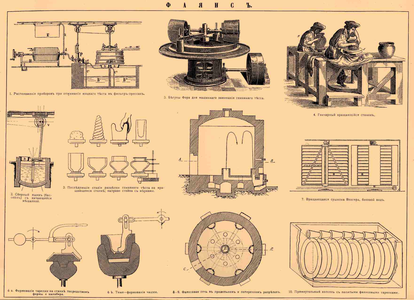 1. Расположение приборов при отжимании жидкого теста в фильтр-прессах. 2. Сборный ящик (бассейн) с качающейся мешалкой. 3. Бегуны Фора для машинного заминания глиняного теста. 4. Гончарный вращающийся станок. 5. Последующие стадии разделки глиняного теста на вращающемся станке; направо стойка с мерками. 6a. Формование тарелки на станке посредством формы и калибра. 6b. Формование чашки на станке посредством формы и калибра. 7. Вращающаяся сушилка Венгера, боковой вид. 8. Фаянсовая печь в продольном разрезе. 9. Фаянсовая печь в поперечном разрезе. 10. Прямоугольный капсель с политыми фаянсовыми тарелками.