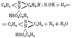 в возможно малом количестве воды и прилил к полученному красному раствору крепкой серной кислоты. Затем, охлаждая этот последний водой, он приливал к нему раствор азотисто-натровой соли до тех пор, пока зеленый цвет раствора сернокислой соли не перешел в оранжево-красный, после чего жидкость сейчас же была влита в тройной объем крепкого спирта; при этом смесь, конечно, сильно разогрелась и замечалось очень бурное выделение азота, указывающее на то, что в оранжевом растворе уже имелся диазоапосафранин, который при последней операции должен был, подобно вообще диазотелам, разлагаться с выделением азота, переходя в продукт замещения группы —N=NOH диазоапосафранина водородом, т. е. в соль Ф.: