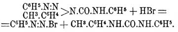 Реакции присоединения Ф. происходят в отсутствие воды, спирта, кислот и т. п. веществ, а потому, по Гольдшмидту, не сопровождаются атомными перегруппировками и могут, следовательно, служить для определения строения. Таким образом, с помощью Ф. может быть решен вопрос о строении таутомерных диазоамидов X—N=N—NH—Y и Y—N=N—NH—X (см.), напр. диазобензолтолуидида С 6 Н 5—N=N—NH—C6H4—CH3 и диазотолуоланилида CH 3—C6H4 —N=N—NH—С 6 Н 5, ибо в первом случае при расщеплении продукта присоединения Ф. должны получиться соль диазобензола и толилфенилмочевина, согласно написанным выше равенствам, а во втором — соль диазотолуола и дифенилмочевина. С амидинами Ф. также соединяется очень легко, причем в реакцию вступают 2 мол. его, соответственно двум остаткам аммиака в молекуле амидина: