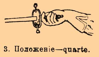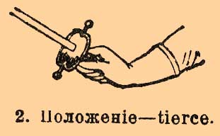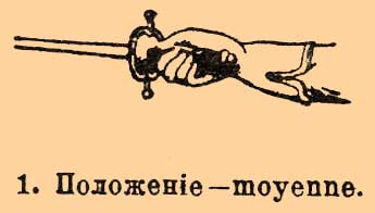 Взяв рапиру, надо стать в позицию ан-гард (en-garde; табл. ф. 1); правая рука согнута в локте, чтобы кисть приходилась на высоте плеча, а конец рапиры против глаза противника, ноги согнуты в коленах и раздвинуты на два следа (шага ит.), каблуки под прямым углом, корпус по возможности опирается на одну левую ногу (обе — ит.) и сохраняет прямое положение, левая рука поднята и согнута в локте так, чтобы ладонь, повернутая наружу, приходилась несколько выше головы.