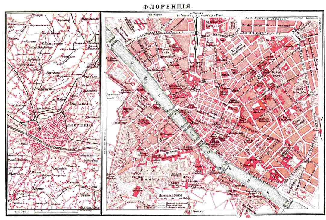 (итал. Firenze, прежде Fiorenza, лат. Florentia — "цветущий город") — главный город провинции Ф., до 1859 г. главный город Тосканского великого герцогства, с 1865 до 1871 г. столица Итальянского королевства, под 43°46' с. ш. и 11°17' в. д. от Гринвича, на высоте, в среднем, 51,8 м, в долине по обоим берегам реки Арно, который в этом месте сжат двумя запрудами (pescaje), имеет от 120 до 160 м ширины и делит город на 2 части. Северная часть города окружена отрогами Апеннинских гор. Ф. после Милана и Турина — самый чистый и опрятный из больших городов Италии. Климатические условия во Ф. в общем довольно благоприятны для здоровья; только для страдающих грудными болезнями пребывание здесь может представлять некоторую опасность ввиду частых и довольно резких изменений в температуре. Средняя температура в январе 5°, в июле 25,1°; средняя годовая температура 14,6° Ц. Жителей в 1881 г. было 169001, в феврале 1901 г. — 204950 челов. Ф., нередко называемая "la bella" (красивая) и "la gentile" (прелестная), давно заслужившая имя "итальянских Афин", значительно увеличилась после срытия (с 1859 г.) городских стен на протяжении почти 10 км. Из девяти сохранившихся городских ворот выдаются Порта алла Кроче (построенная в 1330 г.), Порта Сан Галло (в 1284 г.) с фресками Гирландайо, Порта Романа (построенная в 1328 г. Джакопо Орканья), Порта Сан Фредиано (1324) и Порта Сан Миниато. Две цитадели: меньшая — Бельведере, на самом высоком пункте города; большая — Форте ди Сан-Джованни-Баттиста, в центре города. Вдоль обоих берегов реки набережная, так назыв. Лунгарно. Через р. Арно перекинуто шесть мостов, из которых самый древний Понте алле Грацие, построенный в 1237 г. Трехарочный "Старый мост" (Понте-Веккио), уцелевший еще от римского времени, с лавками золотых дел мастеров, был перестроен в 1362 г., Понте-Санта-Тринита — в 1467 г. Частью очень узкие и из-за выдающихся крыш домов полутемные улицы Ф., вымощенные с 1237 г. кирпичами, а позднее каменными плитами, в настоящее время во многих местах уже расширены. Проложенная на месте прежних укреплений широкая улица Виале-деи-Колли опоясывает лежащую на сев. берегу р. Арно часть города. Из 23 более значительных площадей центром городской жизни является Пиацца делла Синьория, самая богатая произведениями искусства, с Палаццо Веккио и Лоджия деи Ланца; в ее настоящем виде она с XIV в. была ареной народных собраний, празднеств и битв; Савонарола и два доминиканца были в 1498 г. здесь сожжены; на ней стояла до 1873 г. колоссальная статуя Давида работы Микеланджело (в настоящее время в купольном зале академии); здесь же Геркулес, убивающий Кака, работы Бандинелли; большой фонтан с Нептуном и Тритонами работы Амманати и бронзовыми фигурами учеников Джованни да Болонья (1575); Марцокко — бронзовый лев, новая копия с оригинала Донателло в национальном музее; конная статуя Козимо I работы Джованни да Болонья (1594). Пиацца делла Сантиссима Аннунциата с трех сторон окружена колоннадами; украшена двумя фонтанами работы Пиетро Такка (1629) и конной статуей великого герцога Фердинанда I (работы Джованни да Болонья), отлитой в 1608 г. из отнятого у турок металла. На Пиацца Санта Mapиa Новелла, украшенной двумя мраморными обелисками (1608), накануне праздника св. Иоанна Крестителя, покровителя города, по установлению (1563) Козимо I происходили конские ристалища четверок, запряженных в колесницы, с возницами в римских костюмах. Пиацца Санта Кроче с па