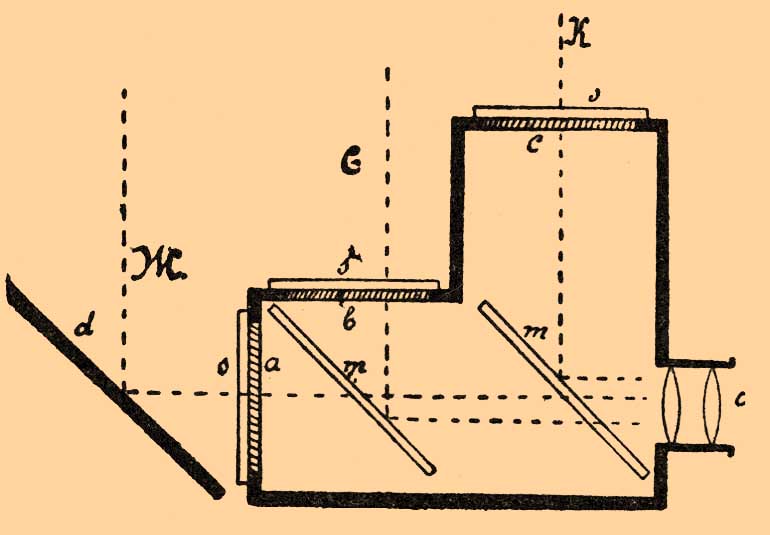 Зеленый диапозитив освещается светом, отраженным от зеркала S; лучи света проходят свободно сквозь две прозрачные стеклянные пластинки mm и попадают в глаз, глядящий на диапозитив через лупу О. Лучи К, прошедшие через красный диапозитив и красное стекло, отражаются от передней стеклянной пластинки в лупу, а лучи С, прошедшие через синий диапозитив, попадают в глаз, отразившись от задней стеклянной пластинки и пройдя сквозь переднюю. В глазу впечатления складываются и дают изображение в его естественных цветах. Ф. приготовляются для стереоскопических картинок и при надлежащей окраске стекол и при правильном расположении диапозитивов дают во многих случаях поразительное по красоте цветов и телесности изображение. Для более правильной передачи цветов Айвс дает соответственное легкое окрашивание и зеркалу S, и стеклянным пластинкам аа. Существуют Ф. и для проекции, в которых три окрашенных диапозитива проектируются тремя фонарями на экран так, что изображения налагаются друг на друга. О причинах, ограничивающих правильность передачи цветов приборами, основанными на принципе Ф., см. Цветная фотография.