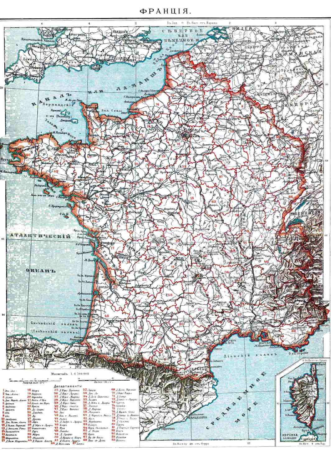 Провинции и департаменты. До 1791 г. Ф. разделялась на 33 провинции или губернии, весьма разнородные по своей величине; в некоторых было до 70000 кв. км, а другие не доходили и до 2000 кв. км. Официально провинции не существуют уже с лишком 100 лет, но население настолько сжилось с ними, что и до сих пор названия провинций не теряют своего смысла, в особенности как обозначение родины или происхождения; это — названия исторические, существовавшие тысячи лет, связанные с географическими особенностями страны, тогда как департаменты — единицы фиктивные, созданные искусственно и таким же образом поддерживаемые. Имена 33 провинций следующие (в порядке их пространства, сперва наибольшие): Гиеннь и Гасконь, Лангедок, Бретань, Шампань, Нормандия, Бургонь, Лотарингия, Прованс, Орлеанэ, Пуату, Дофине, Иль-де-Франс, Франш-Конте, Берри, Овернь, Пикардия, Ангумуа, Лимузен, Мэн, Анжу, Корсика, Бурбоннэ, Лионнэ, Эльзас, Турень, Беарн, Ниверне, Фландрия, Марш, Артуа, Фуа, Руссильон и Венессенское графство. В 1791 г. эти провинции были разделены на департаменты (числом 86). В 1860 г. были присоединены к Ф. земли, пограничные с Италией, и число департаментов возросло до 89 (Савойя, Верхняя Савойя и Морских Альп). После потерь 18 7 1 г. департаментов опять 86 и, сверх того, еще небольшая территория Бельфор (департамент Верхнего Рейна). Площадь департамента в среднем около 6000 кв. км, среднее число жителей около 400 тысяч. Каждый департамент, управляемый префектом, разделяется на округа (arrondissements), управляемые супрефектами. Всех округов во Ф. 362. Каждый округ разделяется на кантоны, а последние на коммуны; каждый кантон избирает одного члена в генеральный совет департамента и имеет мирового судью. Кантонов в 1896 г. было 2899, а коммун — 36170. Средняя величина коммуны — 1,5 кв. км, с 1000 жителей, но коммуны очень неодинаковы и по величине, и по числу жителей (Париж — 2 млн. жителей, Морто, в департаменте Верхней Марны — 15 жителей). Разделение страны на департаменты было сделано поспешно, без соображения с естественными условиями и привычками жителей; границы их очень часто условные; случается, что части одного департамента совершенно окружены землями другого; то же замечание касается границ кантонов и коммун. Названия департаментов по большей части заимствованы от рек, которые сто лет тому назад являлись главными путями сообщения.
