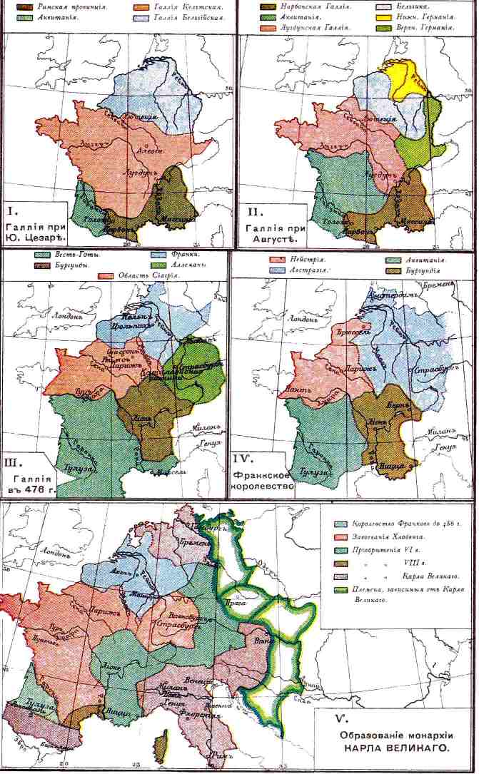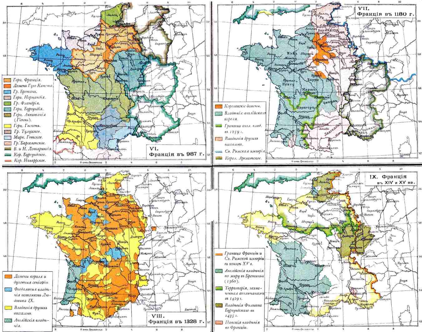 Феодальная эпоха. Слово Ф. происходит от имени германского народа франков, поселившихся в северо-восточном углу Галлии. Первоначально под названием Francia разумели страну между Сеной и Рейном, западная часть которой только и вошла в состав Ф., тогда как юго-западный угол восточной части, вместе с соседней областью к востоку (по Майну), получили название Франконии, равным образом произведенное от имени франков. Возникшее при последних Каролингах, имя Ф. стало с течением времени все более и более приурочиваться к одной только западной части, а в ней — преимущественно к большому герцогству, которое впоследствии и собрало около себя страну (duch é de France, позднее провинция Иль-де-Франс). В эпоху распадения монархии Карла Великого вполне обнаружилось различие в языке между восточными и западными "франками". Когда сыновья Людовика Благочестивого, Людовик Немецкий и Карл Лысый, заключили между собой в Страсбурге союз (842), то вынуждены были принести клятву друг другу перед своими воинами на двух разных языках: романском и германском. В следующем за тем году последовало выделение Ф. в отдельное королевство (843). С этого времени и начинается история собственно Ф. При последних Каролингах, царствовавших полтора века (843—987), Ф. очень много терпела от внешних врагов, вторгавшихся в нее с разных сторон: с севера нападали норманны, с юга сарацины, а внутри страна все более и более разлагалась. В это именно время и происходил процесс феодализации, который привел Ф. к распадению на целый ряд более мелких владений (см. Феодализм). Во второй половине I X в. государственные должности, в том числе должность королевских наместников (графов), стали превращаться в частную собственность, а с ними вместе — и те королевские поместья (домены), пользование которыми должно было вознаграждать должностных лиц за их службу. Вообще, каждый крупный землевладелец приобретал чисто государственные права над жителями своего поместья. Этим разложением государства пользовались внешние враги и беспрепятственно вторгались внутрь страны, пока в некоторых местных центрах не стали, в целях обороны, возникать союзы помещиков-государей, под гегемонией наиболее сильных из них. Благодаря этому к концу Χ в. во Ф. образовалось несколько более крупных княжеств, которые перечислены выше. В последний раз Карл Толстый в конце IX в. соединил под своей властью Германию и Ф., на что французские вельможи пошли в интересах борьбы с норманнами; но после смерти Карла (887) центробежные силы взяли верх. Преемником Карла Толстого на французском престоле был один из наиболее крупных сеньоров, граф парижский Эвд, от которого произошла династия Капетингов (см.). Хотя после его смерти королевское достоинство и вернулось в фамилию Каролингов, однако, им постоянно приходилось считаться с честолюбивыми потомками парижского графа. Преемник Эвда, Карл Простоватый (893—929), вынужден был даже искать опоры у норманнов, вождю которых, Роллону, он уступил в наследственное герцогство целую приморскую область, получившую название Нормандия (912). Кроме парижского графа Роберта, который оспаривал у Карла Простоватого корону, такие же притязания на нее заявил против сына Карла, Людовика Заморского, герцог бургундский Рудольф, которому и удалось на время занять престол. Только после его смерти законный наследник, при пом