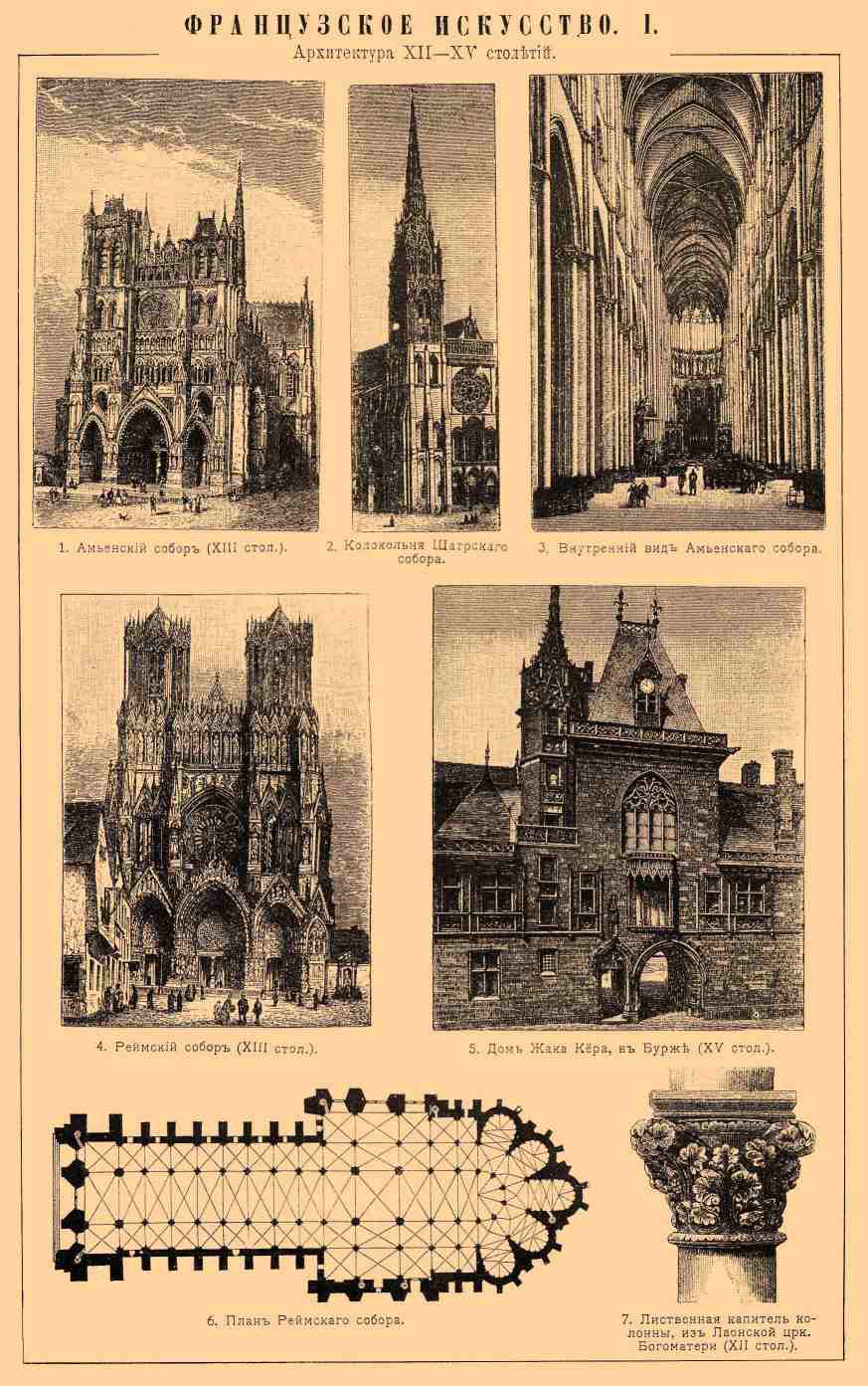 Архитектура XII—XV столетий. 1. Амьенский собор (XIII столетие). 2. Колокольня Шартрского собора. 3. Внутренний вид Амьенского собора. 4. Реймский собор (XIII столетие). 5. Дом Жака Кёра, в Бурже (XV столетие). 6. План Реймского собора. 7. Лиственная капитель колонны, из лаонской церкви Богоматери (XII столетие).