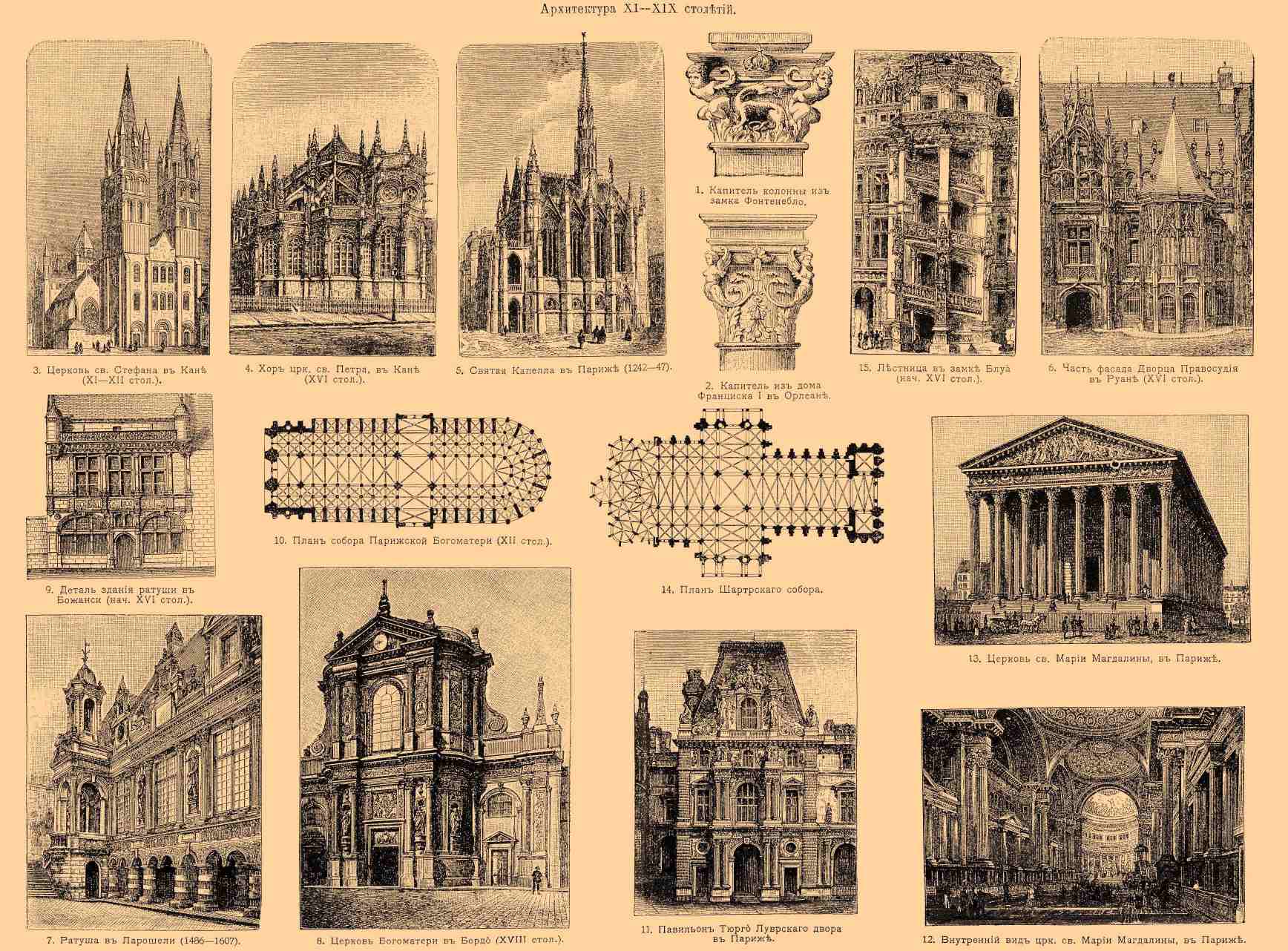 Архитектура XI—XIX столетий. 1. Капитель колонны из замка Фонтенбло. 2. Капитель из дома Франциска I в Орлеане. 3. Церковь св. Стефана в Кане (XI—XII столетия). 4. Хор церкви св. Петра, в Кане (XVI столетие). 5. Святая Капелла в Париже (1242—47). 6. Часть фасада Дворца Правосудия в Руане (XVI столетие). 7. Ратуша в Ла-Рошели (1486—1607). 8. Церковь Богоматери в Бордо (XVIII столетие). 9. Деталь здания ратуши в Божанси (начало XVI столетия). 10. Блан собора Парижской Богоматери (XII столетие). 11. Павильон Тюрго Луврского двора в Париже. 12. Внутренний вид церкви св. Марии Магдалины, в Париже. 13. Церковь св. Марии Магдалины, в Париже. 14. План Шартрского собора. 15. Лестница в замке Блуа (начало XVI столетия).