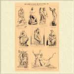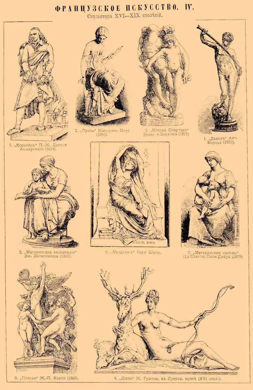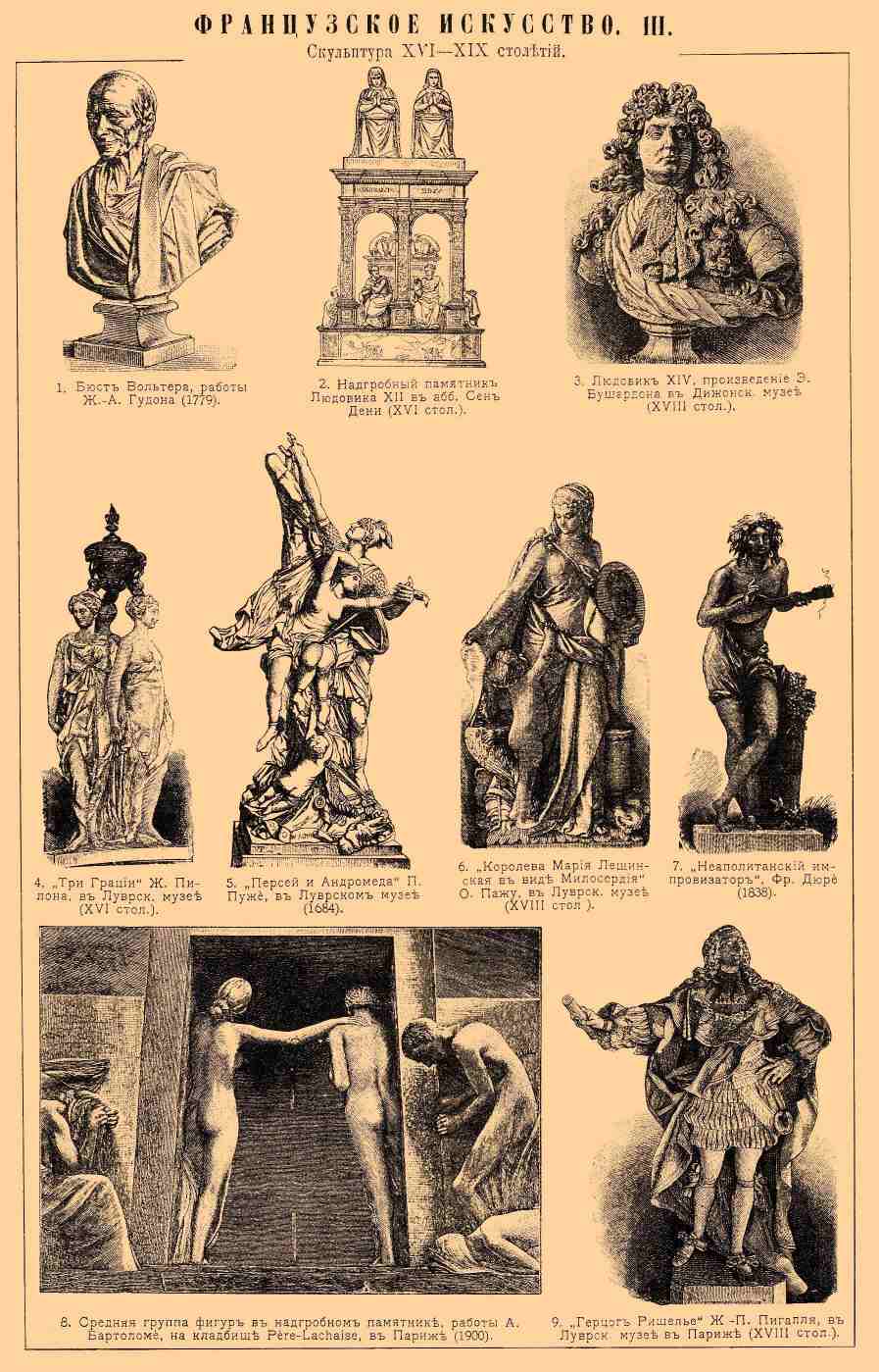 Скульптура XVI—XIX столетий. 1. Бюст Вольтера, работы Ж.-А. Гудона (1779). 2. Надгробный памятник Людовику XII в аббатстве Сен-Дени. 3. Людовик XIV, произведение Э. Бушардона в Дижонском музее (XVIII столетие). 4. "Три Грации" Ж. Пилона, в Луврском музее (XVI столетие). 5. "Персей и Андромеда" П. Пуже, в Луврском музее (1684). 6. "Королева Мария Лещинская в виде Милосердия" О. Пажу, в Луврском музее (XVIII столетие). 7. "Неаполитанский импровизатор" Фр. Дюре (1838). 8. Средняя группа фигур в надгробном памятнике, работы А. Бартоломе, на кладбище P è re-Lachaise, в Париже (1900). 9. "Герцог Ришелье" Ж.-П. Пигалля, в Луврском музее в Париже (XVIII столетие).