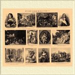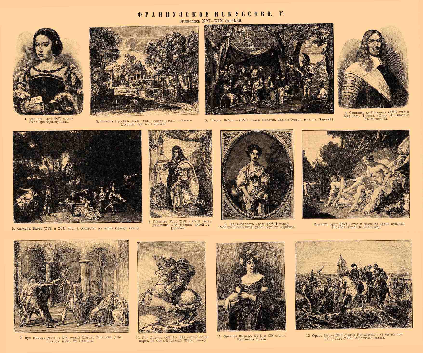 Живопись XVI—XIX столетий. 1. Франсуа Клуе (XVI столетие): Элеонора Французская. 2. Никола Пуссен (XVII столетие): "Исторический пейзаж" (Луврский музей в Париже). 3. Шарль Лебрен (XVII столетие): "Палатка Дария" (Луврский музей в Париже). 4. Филипп де-Шампень (XVII столетие): Маршал Тюрень (Стар. Пинакотека в Мюнхене). 5. Антуан Ватто (XVII и XVIII столетия): "Общество в парке" (Дрезденская галерея). 6. Гиасент Риго (XVII и XVII столетия): Людовик XIV (Луврский музей в Париже). 7. Франсуа Буше (XVIII столетие): "Диана во время купанья" (Луврский музей в Париже). 8. Жан-Батист Грез (XVIII столетие): "Разбитый кувшин" (Луврский музей в Париже). 9. Луи Давид (XVIII и XIX столетия): "Клятва Горациев" (1784; Луврский музей в Париже). 10. Луи Давид (XVIII и XIX столетия): "Бонапарт на Сен-Бернаре" (Версальская галерея). 11. Франсуа Жерар (XVIII и XIX столетия): Баронесса Сталь. 12. Орас Верне (XIX столетие): "Наполеон I в битве при Фридланде" (1836; Версальская галерея).