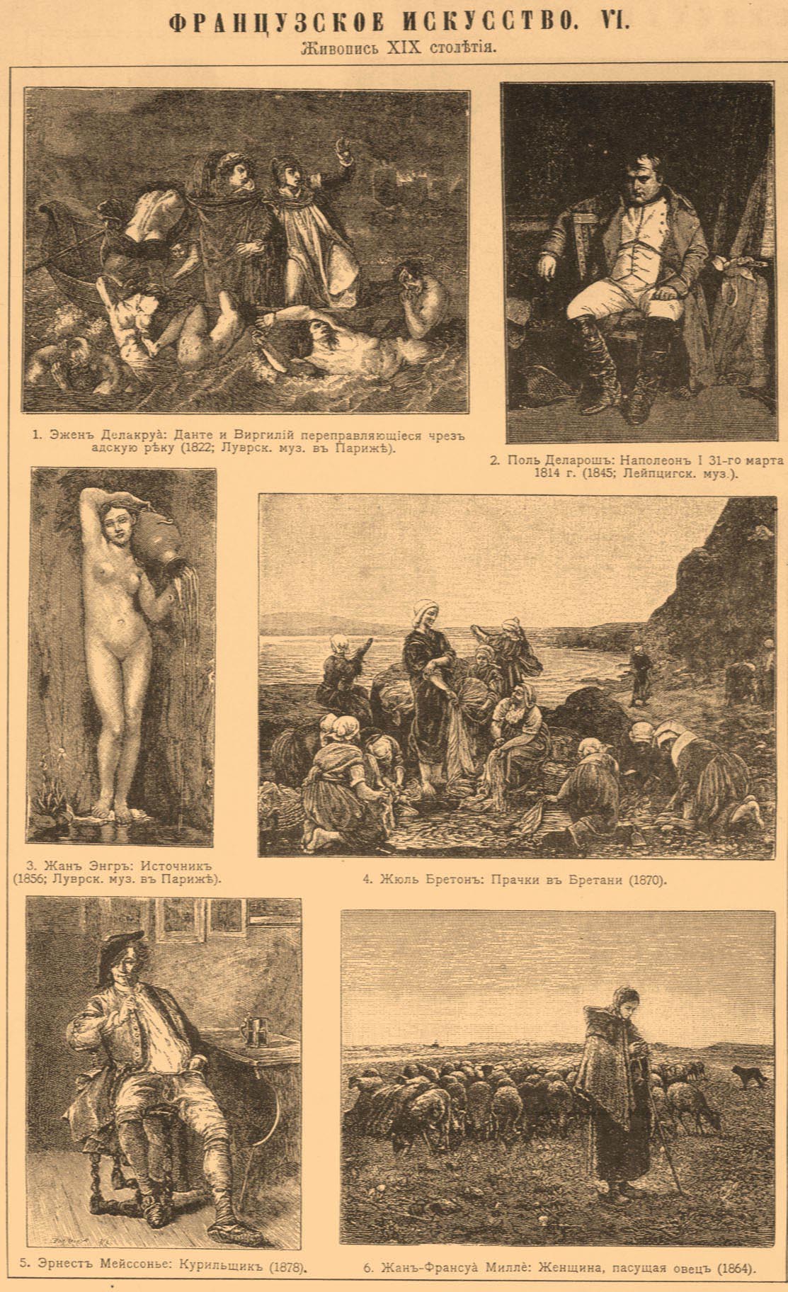 Живопись XIX столетия. 1. Эжен Делакруа: "Данте и Вергилий, переправляющиеся через адскую реку" (1822; Луврский музей в Париже). 2. Поль Деларош: "Наполеон I 31 марта 1814 г." (1845; Лейпцигский музей). 3. Жан Энгр: "Источник" (1856; Луврский музей в Париже). 4. Жюль Бретон: "Прачки в Бретани" (1870). 5. Эрнест Мейссонье: "Курильщик" (1878). 6. Жан-Франсуа Милле: "Женщина, пасущая овец" (1864).