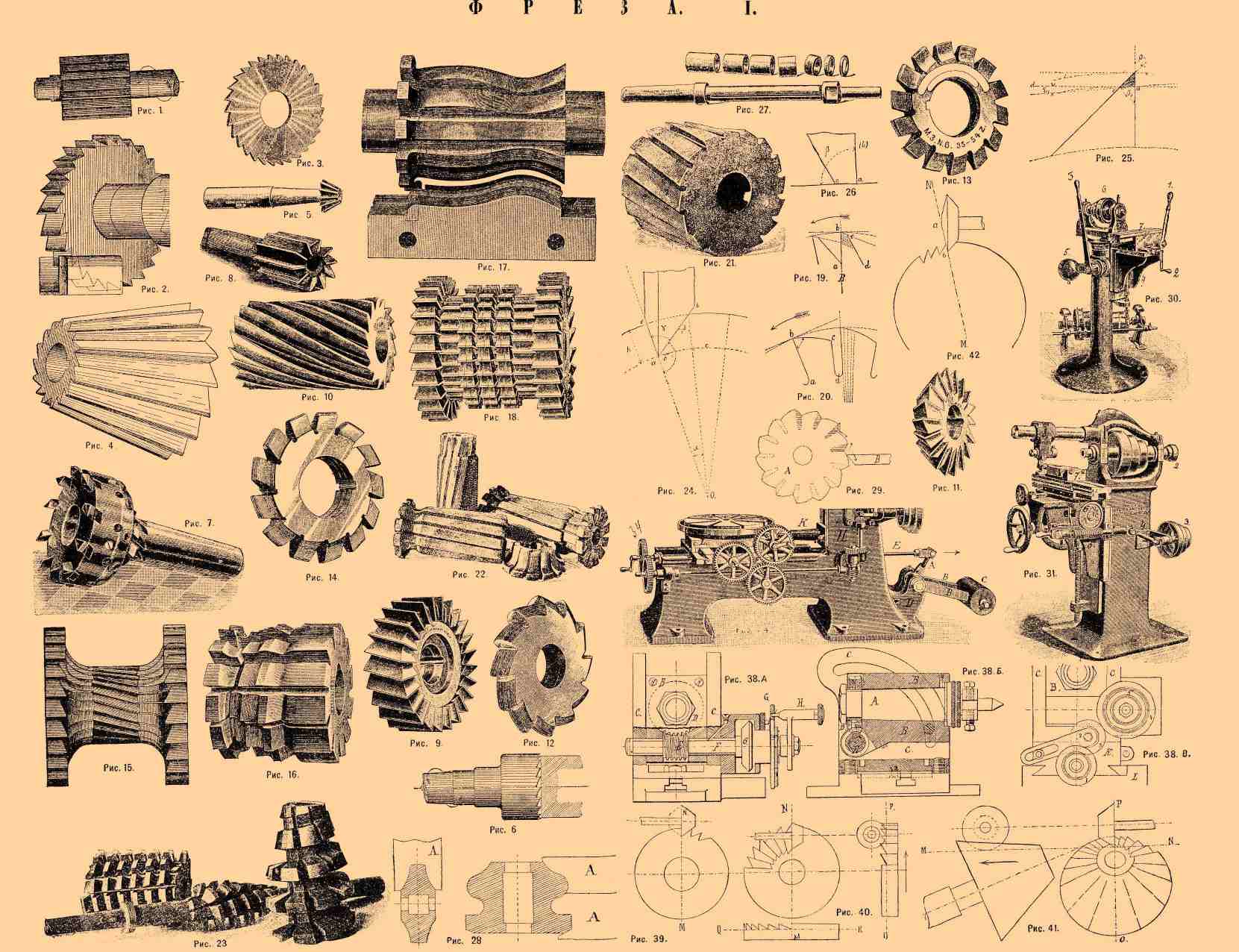[В некоторых русских мастерских шарошка. ]. — Под этим названием, заимствованным с французского (Fraise), известен особый вид режущего инструмента, применяемый при обработке металлов, дерева, кости, рога, кожи и других материалов и состоящий из нескольких соединенных неподвижно резцов, получающих вращательное движение около одной общей оси. В исключительных (правда, редких) случаях, Ф. может состоять и из одного лишь вращающегося резца, или же не вращаться, а качаться около неподвижной оси (так называемой крючки). В настоящей статье рассмотрены будут наиболее употребительные Ф., применяемые лишь при обработке металлов в нормальном машиностроении. Режущие ребра резцов, образующих Ф., имеют вид прямых, ломанных или кривых линий и представляют, в первом случае, производящие одной общей цилиндрической или конической поверхности, или радиусы одного общего круга; во втором и третьем случаях — ломанные или кривые, производящие одного общего тела вращения, или винтовые линии, следующие одной общей цилиндрической поверхности и имеющие одинаковый подъем спирали. Во всех этих случаях ребра всех резцов Ф. обыкновенно совершенно тожественны по форме и равны по величине. Соединение всех резцов (или зубьев), образующих Ф., в одну общую, неподвижную систему производится различными способами. Чаще всего зубья прямо нарезаются на самом теле Ф.; иногда они заготовляются отдельно, вставляются во фрезерный диск и закрепляются в нем клиньями и винтами. Наконец, иногда зубья нарезаются, по несколько зараз, на отдельных сегментах, которые, будучи укреплены на диске Ф. винтами, образуют целый зубчатый обод. Вставные зубцы дозволяют устраивать Ф. больших диаметров, что представляет большие трудности при самородных, т. е. нарезанных в самом теле Ф., зубьях, так как диски больших диаметров при закалке почти всегда коробятся. Зубья (самородные или вставные) располагаются или на одной лишь боковой поверхности Ф., или на одной лобовой, или, наконец, одновременно и на боковой, и на лобовой ее поверхностях. Ф. снабжаются обыкновенно центральным отверстием, которым они надеваются на вращающийся шпиндель фрезерного станка. Чтобы зубцы Ф. могли снимать стружку, необходимо, кроме круговращательного движения около ее оси, сообщить ей еще и поступательное перемещение, вместе с осью, вдоль этой оси или перпендикулярно к ней. В первом случае (весьма редком) Ф. может работать только лобовыми зубьями, и в таком случае она снимает непрерывную спиральную стружку. Во втором случае Ф. может работать и лобовыми, и аксиальными зубьями. Зубья Ф. снимают стружку не более, как на половине описываемых ими окружностей, остальную же часть их кругового пути зубья движутся, не снимая стружки. Действие каждого зуба Ф. уподобляется при этом действию строгального или долбежного резца. В большинстве случаев оставляют ось Ф. неподвижной, поступательные же перемещения, навстречу зубьям Ф., сообщают самому обрабатываемому предмету. Но применяется и второй принцип, т. е. движущаяся ось Ф. при неподвижном обрабатываемом предмете. Условия действия зубцов Ф., указанные выше, от этого, конечно, не изменяются. Абсолютные перерывы в работе фрезерных зубьев происходят лишь во Ф. с очень малым числом зубьев (1—3); при большем числе зубьев, прежде, нежели один зубец закончит рабочий свой ход, уже начинает ра