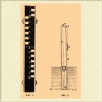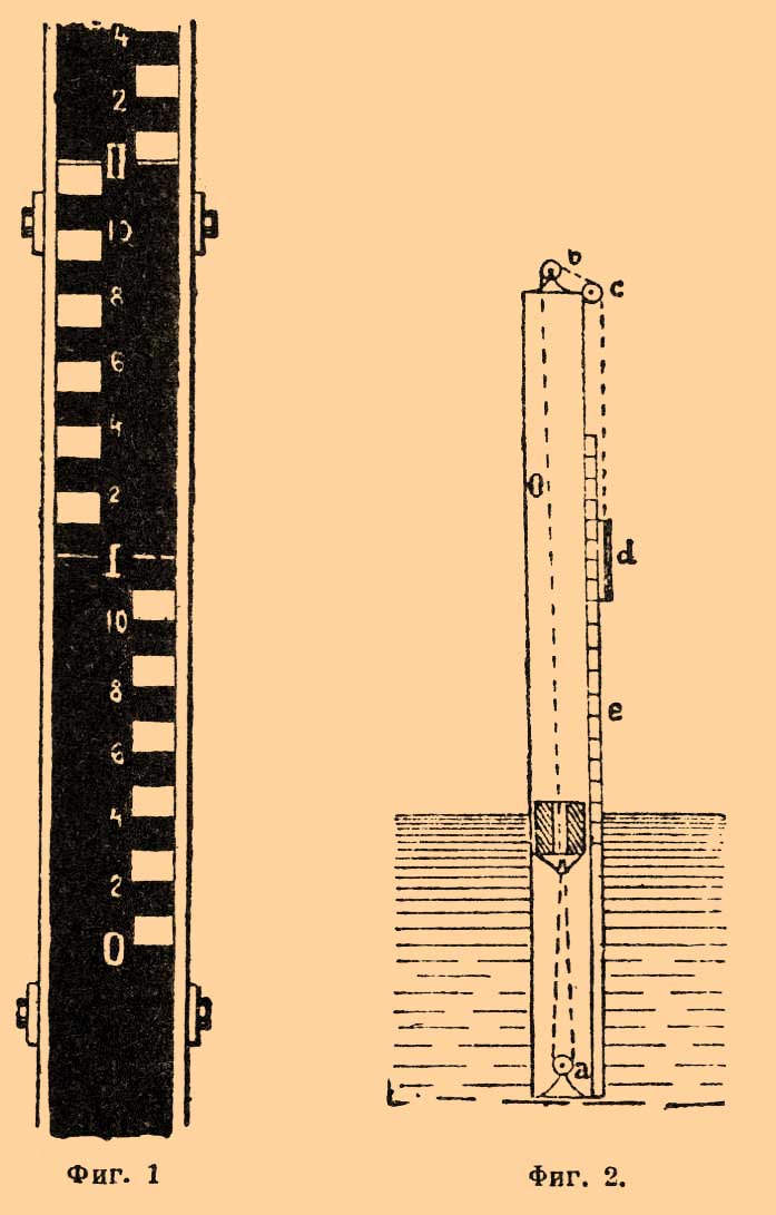 К нижнему краю поплавка прикрепляется цепочка, которая проводится через роульс, а затем пропускается через центральное отверстие поплавка, роульсы b и c и оканчивается грузом d, который натягивает цепочку и удерживает всю систему в равновесии. Груз d, следуя всем движениям поплавка и передвигаясь по шкале, служит указателем стояния уровня воды. Шкала e наносится или на самой трубе, или состоит из прикрепляемой к последней отдельной металлической линейки. Иногда для предохранения груза d от влияния ветра, помещают его в особую трубу с продольным прорезом, вдоль которого движется индекс по шкале.