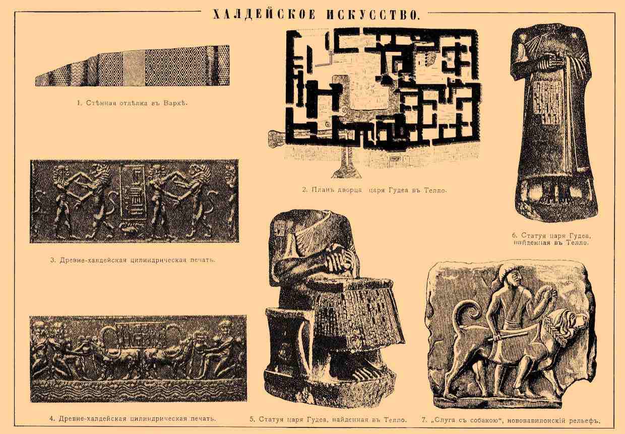 1. Стенная отделка в Варке. 2. План дворца царя Гудея в Телло. 3. Древнехалдейская цилиндрическая печать. 4. Древнехалдейская цилиндрическая печать. 5. Статуя царя Гудеа, найденная в Телло. 6. Статуя царя Гудеа, найденная в Телло. 7. "Слуга с собакой", нововавилонский рельеф.