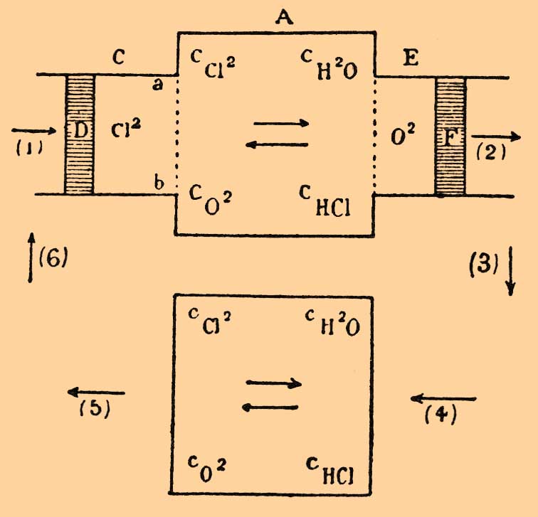 В цилиндре С мы имеем поршень D и перепонку ab, которая проницаема только для хлора. С помощью поршня D и полупроницаемой перепонки ab мы можем ввести в пространство А желаемое количество хлора. Подобным же образом затем мы введем и водяной пар, тогда как кислород и хлористый водород выведем из этого пространства, пользуясь цилиндром E поршнем F и соответственными полупроницаемыми перепонками. Если газы имеют ту же концентрацию, что и в A, то в А ничего не изменится, если произойдет образование кислорода и хлористого водорода, которые затем будут уведены. Теперь выведенные газы О 2 и НCl при той же температуре обратимым процессом будем сжимать или расширять до тех пор, пока не получим такой концентрации, которая имеет место в В, тогда, по предыдущему, произведем обратное превращение и, наконец, полученные продукты приведем к концентрациям, отвечающим А. Так как этот замкнутый цикл совершился при постоянной температуре, то сумма всех работ равна нулю. Следовательно: