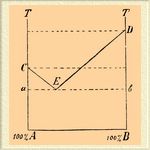 Детальное изучение диаграммы показывает следующее. Над кривыми СЕ и ED мы имеем область жидких систем, называемых обыкновенно раствором В в А (А плавится значительно ниже B), но которые, очевидно, настолько же и растворы А в В. Выше горизонтальной пунктирной линии, начинающейся из точки D, оба тела смешиваются в виде жидкостей во всех отношениях (от 100% А до 100% В); между этой линией и горизонтальной пунктирной линией, начинающейся в точке С, тело А, жидкое в этих условиях, может быть прибавляемо к раствору в неопределенном количестве, не нарушая его однородности, а прибавление тела В ограничено кривой его растворимости DE; раствор благодаря этому является как бы односторонним. Ниже горизонтальной пунктирной линии, начинающейся в точке С, оба твердых тела обладают ограниченной способностью плавить друг друга; раствор симметричен. Ниже пунктирной линии ab оба тела могут быть взяты в любых отношениях, но они не имеют никакого влияния друг на друга; они абсолютно индифферентны и при дальнейшем понижении температуры, и мы не в состоянии привести их в этих условиях во взаимодействие (внешними факторами равновесия системы предполагаются температура и давление пара A + В). В треугольнике СаЕ выпадает в твердом состоянии избыточное твердое тело A, находящееся в соприкосновении и равновесии с насыщенным им, телом A, раствором; в треугольнике DbE выпадает в твердом состоянии тело B, тоже находящееся в соприкосновении и равновесии с насыщенным им раствором. То, что лежит в прямоугольнике АаВb мы называем, обыкновенно, механической смесью, хотя собственно никакого смешения взятых тел тут не имеется [Отрицая смешение тел, мы имеем в виду их безразличное друг к другу отношение и их полную пространственную обособленность. Несомненно, что какой-нибудь эвтектический металлический конгломерат (см. Сплавы) на невооруженный микроскопом глаз производит впечатление однородного тела.]; они настолько же смешаны, как если бы находились и в отдельных приборах; потому более правильно называть такую "механическую" смесь вместе с Б. Роозебоомом (см. Стереоизомерия) конгломератом; составные части конгломерата могут быть отделены друг от друга различными приемами и, между прочим, с помощью тяжелых жидкостей (метод Черча и Тулэ в минералогии). Состав такого конгломерата может варьировать почти от 100% А до 100% B, но очевидно, что для каждой данной смеси он, при целом ряде изменений температуры, будет оставаться постоянным; и сочтем ли мы его определенным соединением, или нет, — будет зависеть от большей или меньшей легкости, с которой нам удастся доказать его физическую неоднородность в различных точках системы и от большей или меньшей доступности для нас эвтектической точки Е, выше которой неоднородность конгломерата скажется яснее (в твердом состоянии будет ими тело А или тело В), если только концентрация его не отвечает случайно эвтектической точке, когда и выше ее вещество будет относиться, как вполне однородное, для которого эвтектическая температура будет температурой плавления [Что такой конгломерат плавится при эвтектической температуре в однородную жидкость, доказано опытами Галлока (1888), нашедшего, что конгломерат опилок кадмия (1 ч.), олова (1 ч.), свинца (2 ч.) и висмута (4 ч.), отвечающий по составу сплаву Вуда, плавятся на водяной бане (при достаточно долгом наг