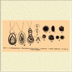 Содержимое клеток распадается при этом не на 4, а уже на 8 или 16 частей, которые развивают реснички и освобождаются. Быстро двигаясь в воде, они сталкиваются носиками, теряют жгутики и сливаются в одну массу шаровидной формы, называемую зигоспорой (фиг. I, G, H, фиг. III, Н) и являющуюся продуктом полового акта. Содержимое такой зигоспоры отстает очень часто от оболочки, съеживается и выделяет еще одну, новую оболочку, которая имеет очень часто правильно волнистые края, так что сама зигоспора принимает звездообразную форму, причем старая оболочка, обыкновенно, разрушается. Оставаясь некоторое время без изменения, зигоспоры, как гладкие, так и звездчатые, изменяются потом в цвете, становясь красными или бурыми, причем в плазме у них откладываются капли масла. После некоторого, часто продолжительного, покоя содержимое зигоспоры зеленеет и распадается на 4 отдельности путем двукратного деления на две части, каждая из вновь образовавшихся таким путем вегетативных особей развивает реснички, освобождается и размножается через некоторое время опять бесполым способом. Среди различных родов и даже видов X. замечается значительное разнообразие в половом процессе. Так, у C a rteria multifilis (Fres) Dill, копулируют настоящие зоогонидии, т. е. особи, совершенно лишенные оболочки, как это наблюдается у высших водорослей. У Chlamydomonas rostrata Cienk и некоторых других половые особи снабжены оболочкой, но теряют ее перед самым актом слияния. Существуют, наконец, и такие формы, которые сливаются в оболочках, соединяя их и выделяя в зигоспоре новую самостоятельную оболочку. Таким образом, у только что названных категорий продукт слияния (зигоспора) должен быть назван изоспорой, так как половые особи здесь равнозначащи, и отличить мужской от женской нельзя. У другой категории X. половой процесс выражен в форме типичной оогамии, где ясно обособлены мужские и женские особи, а потому продукт их копуляции должен быть назван ооспорой. Такой половой процесс мы наблюдаем у Chlamydomonas Braunii и Ehrenbergii Dill: одни из клеток этих организмов распадаются на 2 — 4 больших особи, а другие на 8 маленьких; большие клетки играют здесь роль женской особи, а маленькие мужской, причем во время полового акта мужские особи прикладываются к женским и сливаются с ними, оставляя на своем месте пустую оболочку, вследствие чего на ооспоре очень часто можно видеть, по оставшейся мужской оболочке, место происходившей копуляции (фиг. I, H). Эти нормальные процессы развития X. могут видоизменяться под влиянием неблагоприятных условий существования. Молодые особи, образовавшиеся путем деления материнской, не развивают при этом жгутиков и не освобождаются, а образуют неподвижную колонию, продолжая повторно, и притом многократно, делиться. Оболочки материнских клеток не разрушаются в этом случае, а образуют целую систему вставочных оболочек. Такая стадия развития X. называется Gloeocystis (фиг. I, D), так как первоначально ее принимали за особый род зеленых водорослей и описывали под этим именем, и только впоследствии Ценковский доказал принадлежность Gloeocystis к X. Иногда оболочки Gloeocystis сильно остуденевают; общий вид такой колонии сильно изменяется и очень напоминает собой такую же стадию развития бактерий, известную под именем Zoogloea. У X. эта стадия называется Palmella, так как также описывалась прежде за самостоятельный организм, 