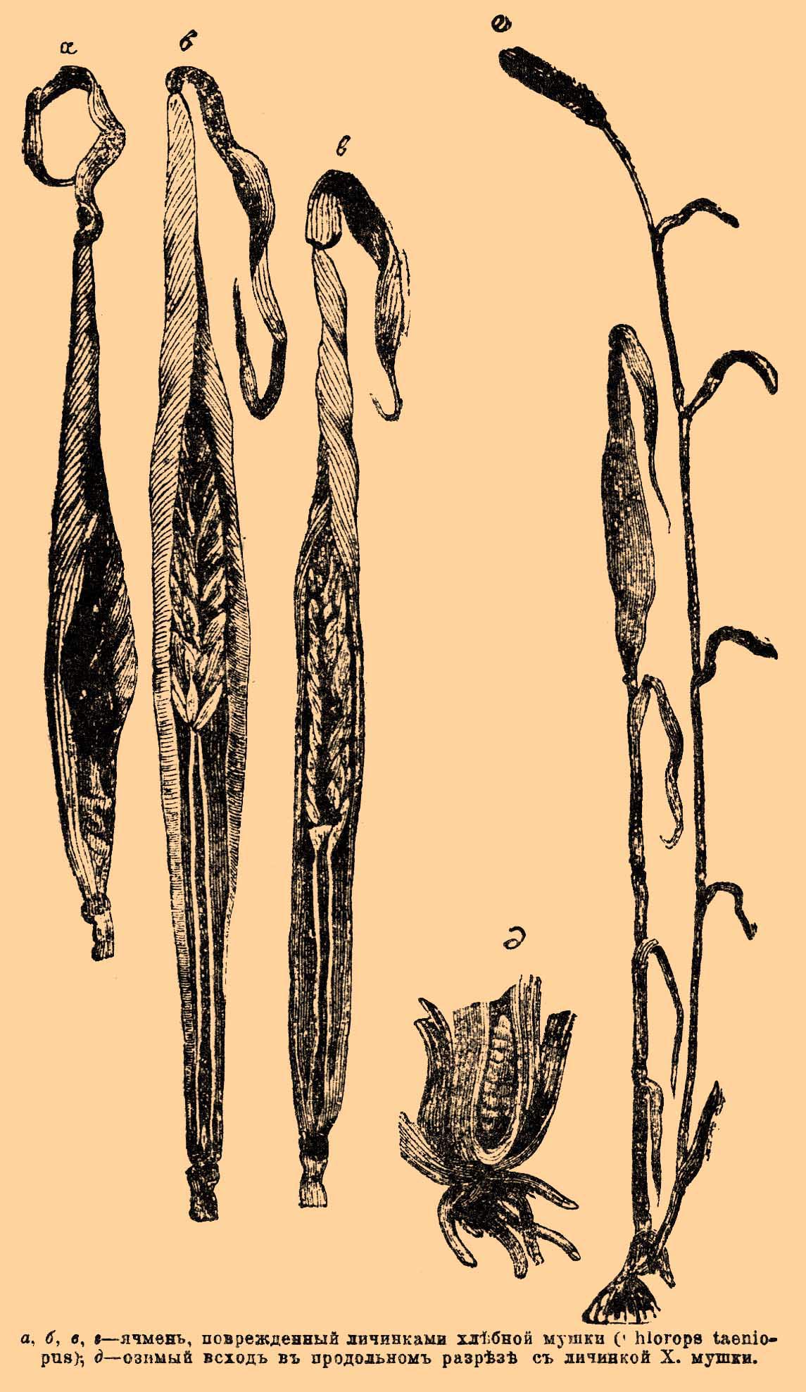 a, б, в, г — ячмень, поврежденный личинками хлебной мушки (hlorops taeniopus), д — озимый всход в продольном разрезе с личинкой X. мушки.