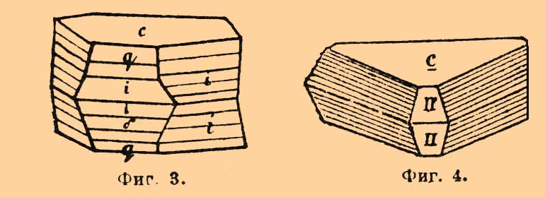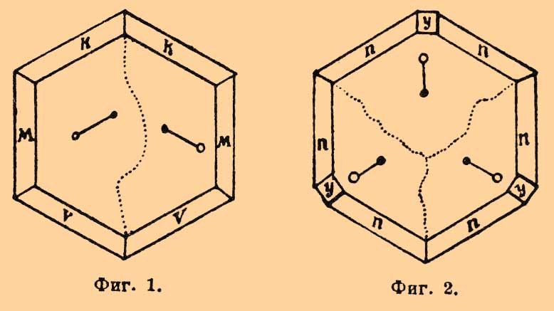 В зависимости от характера сростания неделимых получаются чрезвычайно разнообразного вида двойники (фиг. 1) и тройники (фиг. 2), обладающие совершенно гексагональным габитусом;