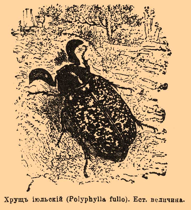 (Polyphylla fullo) — жук из семейства пластинчатоусых жуков (Lamellicornia s. Scarabaeidae), принадлежащий к группе Melolonthidae, или хрущей; называется также пестрым или мраморным X. Род Polyphylla весьма близок к роду Melolontha (см. Майский жук) и отличается от него 5 пластинками в булаве усиков самок (у самцов 7 пластинок) и длинными крючковидными зубцами на когтях лапок (у самцов при основании их, у самок посередине). Усики состоят из 10 члеников; передние голени с 2 или 3 зубцами и конечным шипом; первый членик лапок на половину длиннее каждого из следующих трех. Наиболее известный европейский вид — P. fullo является самым крупным из всех европейских X. Цвет его светло-бурый или красно-бурый, переходящий иногда в почти черный; полоски по сторонам головы около глаз, срединная полоска на грудном щите, несколько пятен там же и много неправильных пятен на надкрыльях образованы из мелких белых чешуек; на надкрыльях пятна эти могут иногда сливаться друг с другом, так что от бурого цвета надкрыльев остаются отдельные точки. Грудь покрыта густыми длинными серыми волосками, длина жука 25—35 мм. X. июльский встречается в Средней и Южной Европе; в России северная граница его распространения определяется линией от Ковно на Самару (он найден был в губерниях Ковенской, Гродненской, Могилевской, Киевской, Волынской, Херсонской, Подольской, Таврической, Полтавской, Екатеринославской, Харьковской, Воронежской, Самарской и Саратовской); на Кавказе встречается особая разновидность его — boryi. Жук встречается по преимуществу в песчаных местностях и появляется в июле; он объедает листья различных растений: сосен, дубов, буков, акаций, тополей и других деревьев, а также нападает и на травянистые растения. Жуки издают скрипящие звуки, обусловливаемые трением предпоследнего брюшного кольца о выдающееся ребрышко на нижней стороне надкрыльев. Самки откладывают яйца в землю, где из них выходят личинки, живущие, по всей вероятности, несколько лет в земле. Личинки по общему виду весьма похожи на личинок майского жука (см.), но значительно крупнее их, достигая 80 мм длины. Они толстые, желтовато-белые, с большой головой, на которой находятся 4-члениковые усики и сильно развитые жующие ротовые части; ноги довольно длинные, на задней паре нет коготков; хитиновый покров тела с отдельно стоящими длинными волосками и короткими острыми щетинками; впереди заднепроходного отверстия два очень коротких ряда шипиков.