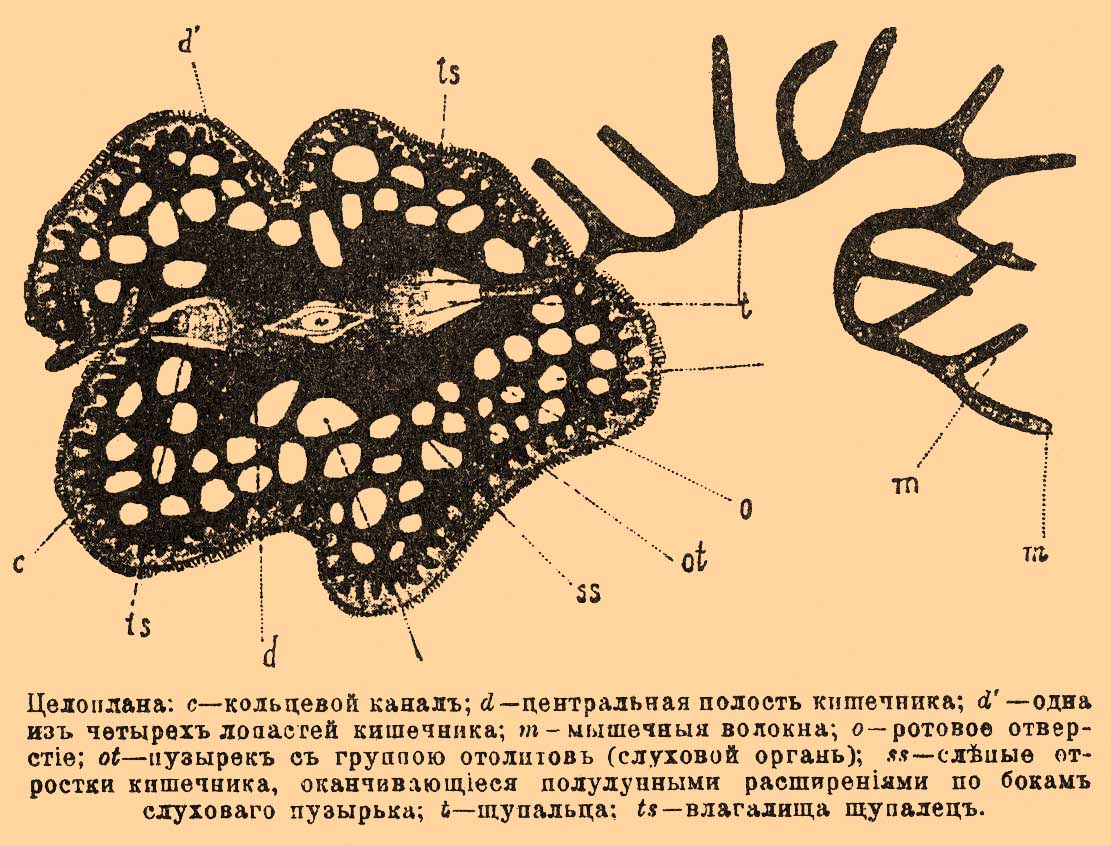 Целоплана: с — кольцевой канал; d — центральная полость кишечника; d' — одна из четырех лопастей кишечника; m — мышечные волокна, о — ротовое отверстие; ot — пузырек с группой отолитов (слуховой орган); ss — слепые отростки кишечника, оканчивающиеся полулунными расширениями по бокам слухового пузырька; t — щупальца; ts — влагалища щупалец.