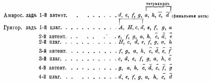 Главной нотой плагального или производного лада была не его тоника, а тоника его коренного лада, которою плагальный лад и должен был оканчиваться. Напр., первый плагальный лад от А до а должен был оканчиваться финальною нотою своего коренного лада (d — đ), т. е. тоникою d. Тождественные по звуку лады: первый автентический (d — đ) и четвертый плагальный (d — đ) отличались друг от друга тем, что у первого была финальной нотой (тоникой) đ, a y четвертого плагального нота g (по коренному ладу g — ġ). Эти восемь ладов схожи с нашими гласами (см. Глас). При теоретике Глареане (XVI в.) произошла перемена в системе Ц. ладов, и они получили греческие названия. Эти церковные лады состоят из постепенного чередования ступеней гаммы do мажор. Каждый из этих ладов заключает в себе восемь ступеней (белые клавиши на фортепиано). Таких ладов шесть: ионийский (начиная от do), дорийский (от re), фригийский (от mi), лидийский (от fа), миксолидийский (от sol), эолийский (от la). Каждый из этих ладов имеет свою особую начальную ступень (тонику) и особый порядок, в котором чередуются тоны и полутоны. Каждая церковная гамма делится на два раздельных тетрахорда. Первый тетрахорд начинается тоникой, второй — доминантой.