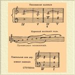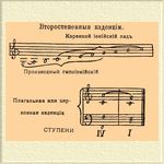 Характерную черту каждого Ц. лада составляют не только чередующиеся в известном порядке тоны и полутоны, но и мелодические каденции. Каждый Ц. лад имеет две каденции. При восходящем направлении гамма каденция состоит из седьмой и восьмой ступеней, при нисходящем — из второй и первой. Все Ц. гаммы в нисходящем направлении имеют каденции без хроматического изменения предпоследней ступени, т. е. самостоятельные; в восходящем направлении они чаще имеют каденции несамостоятельные, т. е. со знаком повышения на седьмой ступени для получении вводного тона, отстоящего от восьмой ступени на диатонический полутон. Только ионийская и фригийская гаммы имеют в восходящем направлении мелодическую каденцию самостоятельную.