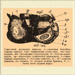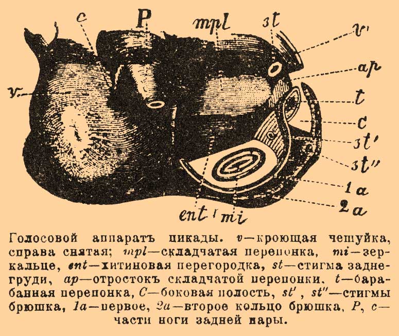 Голосовой аппарат цикады. v — кроющая чешуйка, справа снятая; mpl — складчатая перепонка, mi — зеркальце, e nt — хитиновая перегородка, st — стигма заднегруди, ар — отросток складчатой перепонки. i — барабанная перепонка, С — боковая полость, st', st" — стигмы брюшка, 1а — первое. 2а — второе кольцо брюшка, Р, с — части ноги задней пары.