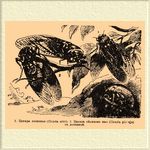 1. Цикада ясеневая (Cicada orni). 2. Цикада обыкновенная (Cicada plebeja) с личинкой.