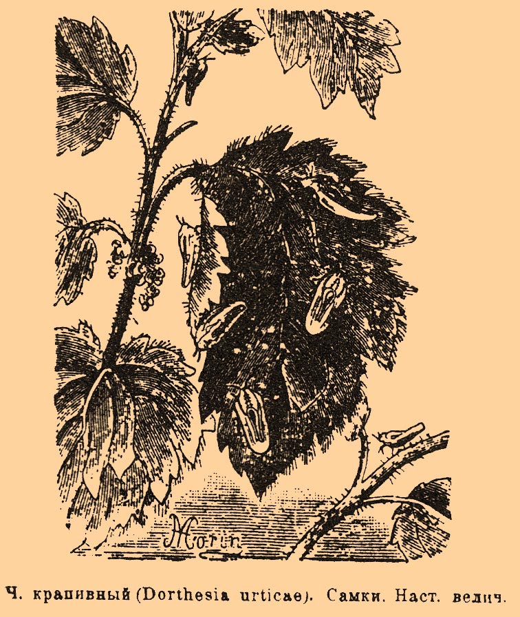 (Dorthesia urticae) — встречается в средней Европе на крапиве и молочае (Euphorbia). Усики самок 8-, самцов 9-члениковые; у самцов задние крылья рудиментарные (напоминают по форме жужжальца мух); самки зеленого цвета, покрыты густым белым налетом, ведут подвижный образ жизни; длина 2 мм.