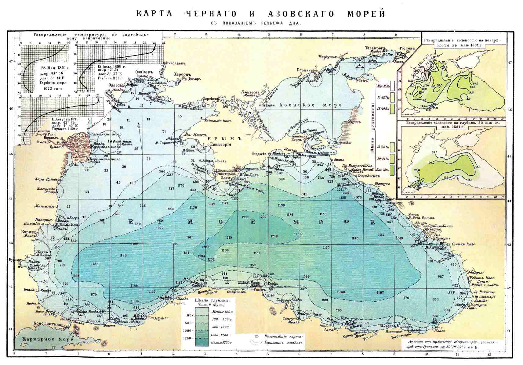 Температура и соленость воды в открытой части Ч. моря известна только для летних месяцев. Из следующей таблички средних температур и солености на разных глубинах для конца мая, середины июля и августа нового стиля (градусы Ц.) видно, что максимальная температура поверхности в августе и что температура убывает с глубиной до глубины 35 саженей, а затем снова повышается.