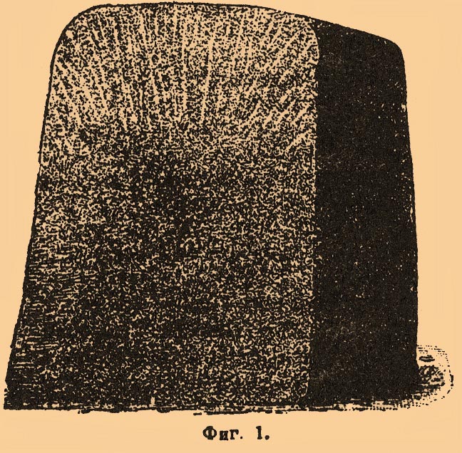 Известно, что некоторые сорта чугунов, не содержащие в себе избытка кремния, будучи расплавлены, обладают свойством при медленном охлаждении образовывать излом серый, при быстром же охлаждении — излом белый, лучистый, причем в первом случае масса получается мягкая и до некоторой степени вязкая, во втором же случае — твердая и хрупкая. Если, расплавив подобный сорт чугуна, принять меры к тому, чтобы отливка остывала быстро лишь с поверхности, сердцевине же ее было обеспечено охлаждение медленное, то можно вызвать одновременное проявление застывающим чугуном обоих вышеуказанных свойств, а потому и сопровождающих остывание результатов, т. е. получить отливку с белым и жестким поверхностным слоем, на сером, мягком ядре. Лучи белого излома направляются при этом от поверхности отливки в глубь ее, перпендикулярно к этой поверхности, и если отливка произведена удачно, — они, по мере удаления от поверхности, постепенно утрачивают свою резкость и незаметно сливаются с серым ядром отливки. Излом одной из подобных удачных закаленных отливок изображен на прилагаемой фиг. 1.
